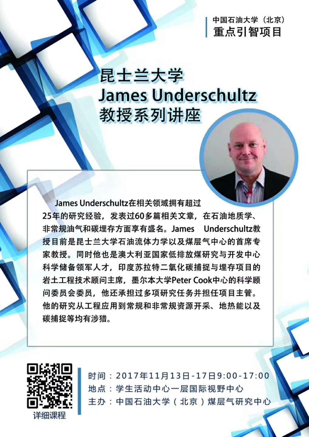 James Underschultz在相关领域拥有超过25年的研究经验,发表过60多篇相关文章,在石油地质学、非常规油气和碳埋存方面享有盛名。James Underschultz教授目前是昆士兰大学石油流体力学以及煤层气中心的客座教授。同时他也是澳大利亚国家低排放煤研究与开发中心科学储备领军人才,印度苏拉特二氧化碳捕捉与埋存项目的岩土工程技术顾问主席,墨尔本大学Peter Cook中心的科学顾问委员会委员,他还承担过多项研究任务并担任项目主管。他的研究从工程应用到常规和非常规资源开采、地热能以及碳捕捉等均有涉猎。