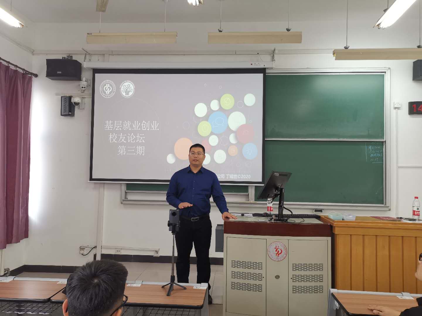 会上,丁观世详细介绍了自己的工作和创业经历及公司发展历程,并为到场同学针对就业创业方面需要注意的问题进行了交流分享。