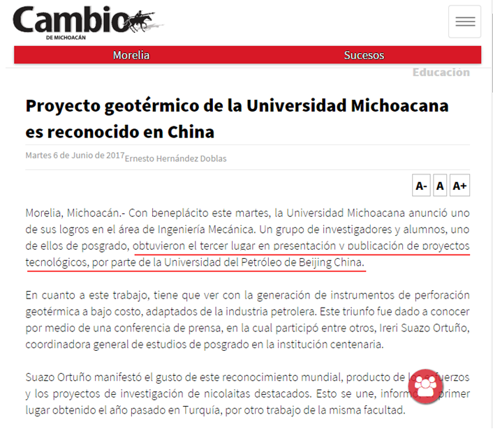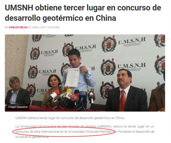 墨西哥多家媒体对U.M.S.N.H的学生来中国参加博士生论坛并获奖一事进行了报道。报道称,博士生论坛活动是具有国际视野的交流活动,U.M.S.N.H的学生参赛作品围绕地热这一主题进行研究,其成果将会对墨西哥乃至世界石油行业发展的产生影响,充分体现了本次全国博士生学术论坛对于推进石油行业技术发展的重要意义。