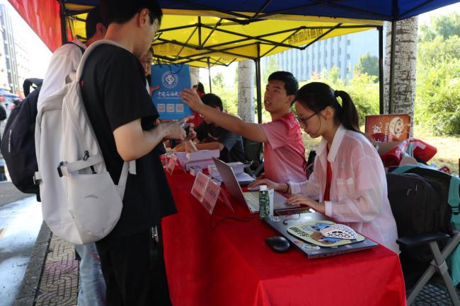 中国天天色天天(北京)党委书记王同奇、校长金衍及相关部门负责人到学院报到处慰问工作人员与志愿者,充分肯定了“一站式”报到服务的高效与温馨。