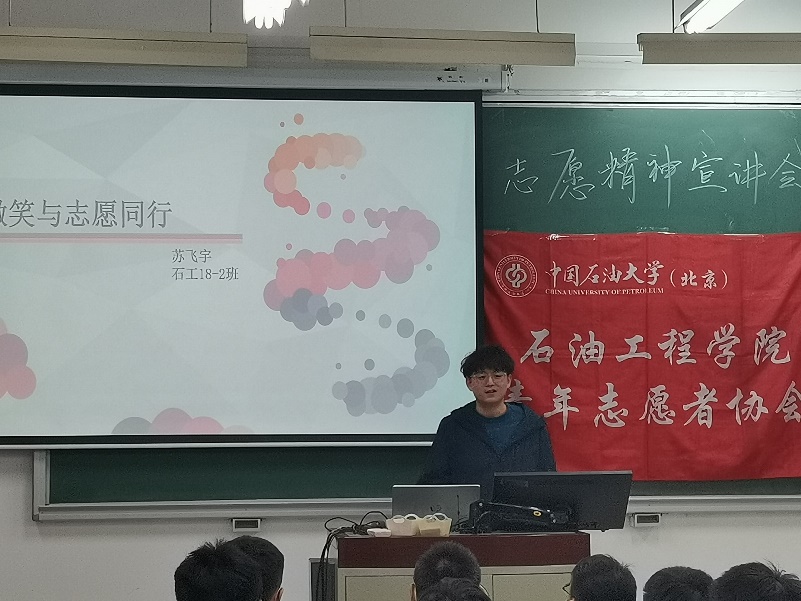 苏飞宇学长分享了自己在北京延庆区世园会和献血急救等方面的志愿经历与体会,并且形象生动地向我们解读了作为合格的志愿者应当尽到的责任与义务。
