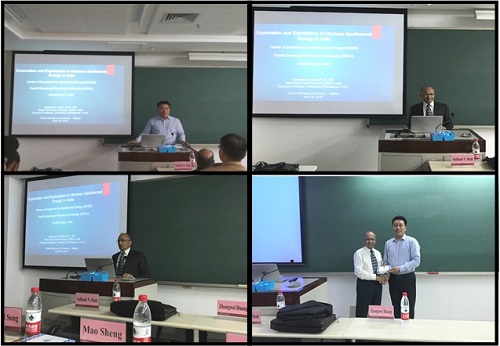 Shah教授首先分析了印度地热田的开发利用情况,包括地理位置、地质条件、生产排量和采出温度;介绍了成立的地热能卓越中心(CEGE),组织成员与研究进展;重点展示了CEGE在Dholera、Unai和Candhar地质勘探,地热发电和地热供暖的发展情况。为了推广地热利用和避免化石燃料的过度消耗,目前中心成功建立了印度首个循环热泵系统,可有效改善区域供暖和制冷;然后,介绍了CEGE举办的第三届国际地热会议,并对地热中心的未来研究计划进行了展望;最后,Shah教授详细讲述了地热中心的DCS实验室,可用于钻井液、水泥浆、裂缝导流能力及储层伤害方面的深入测试和评价,旨在为地热推广利用提供技术支撑。讲座结束后,与会师生与Shah教授进行了积极的学术交流与互动,现场氛围热烈。
