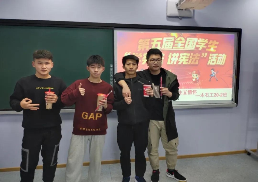 本石工20-3班开展了“学习宪法”主题教育知识竞赛活动,由组织委员抽题并请同学回答。团员嘎玛拉姆说:“本次主题教育活动内容丰富多彩,调动了同学们融入集体活动的积极性。例如:抢答环节,把我们带入了活动的紧张气氛中;“必答.50分”的题目一出,更像是一场运气和胆量的比拼。同学们积极参与各项环节,活动内容让我们了解到我国在依法治国方面的更多举措,进一步增强法制理念,巩固了法律文化知识和法律素养,起到了宣传宪法知识和培养宪法意识的重要作用。”