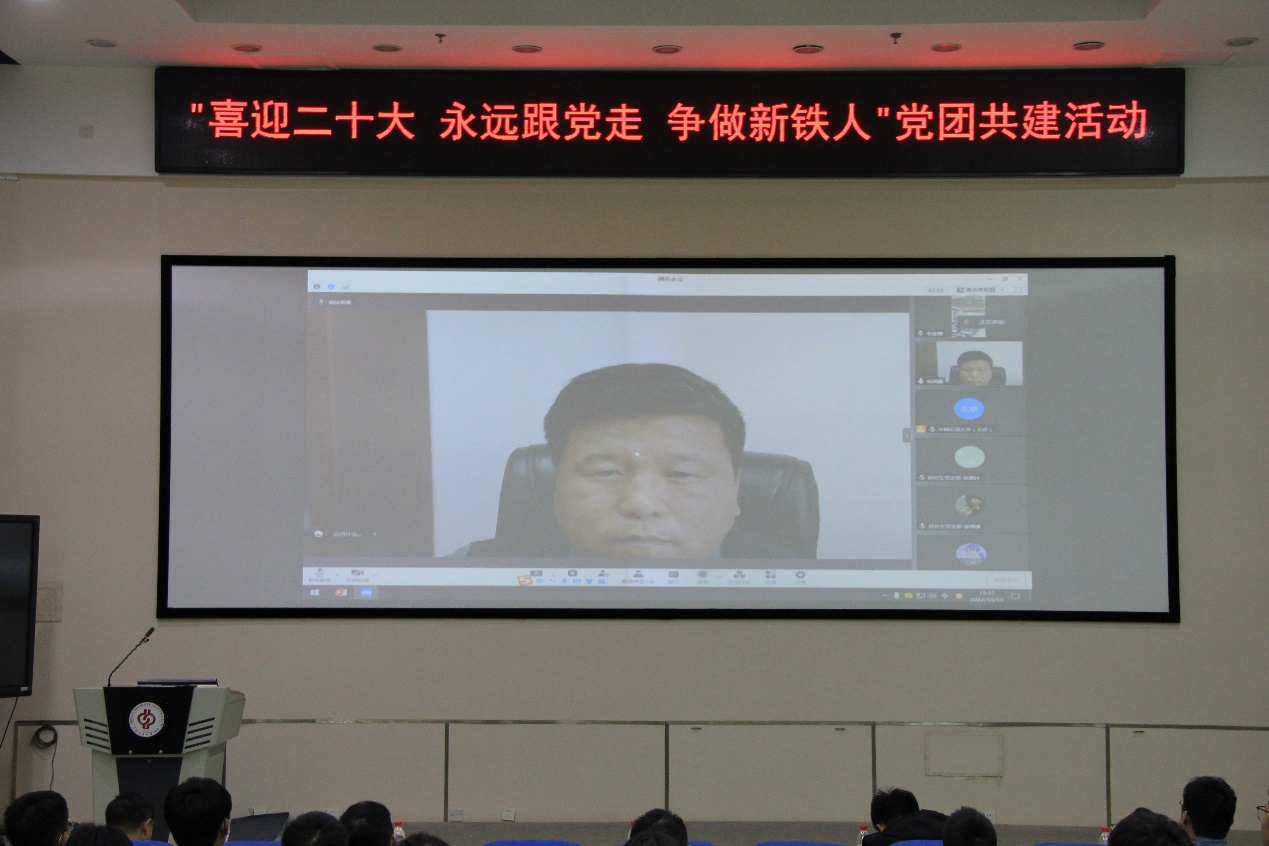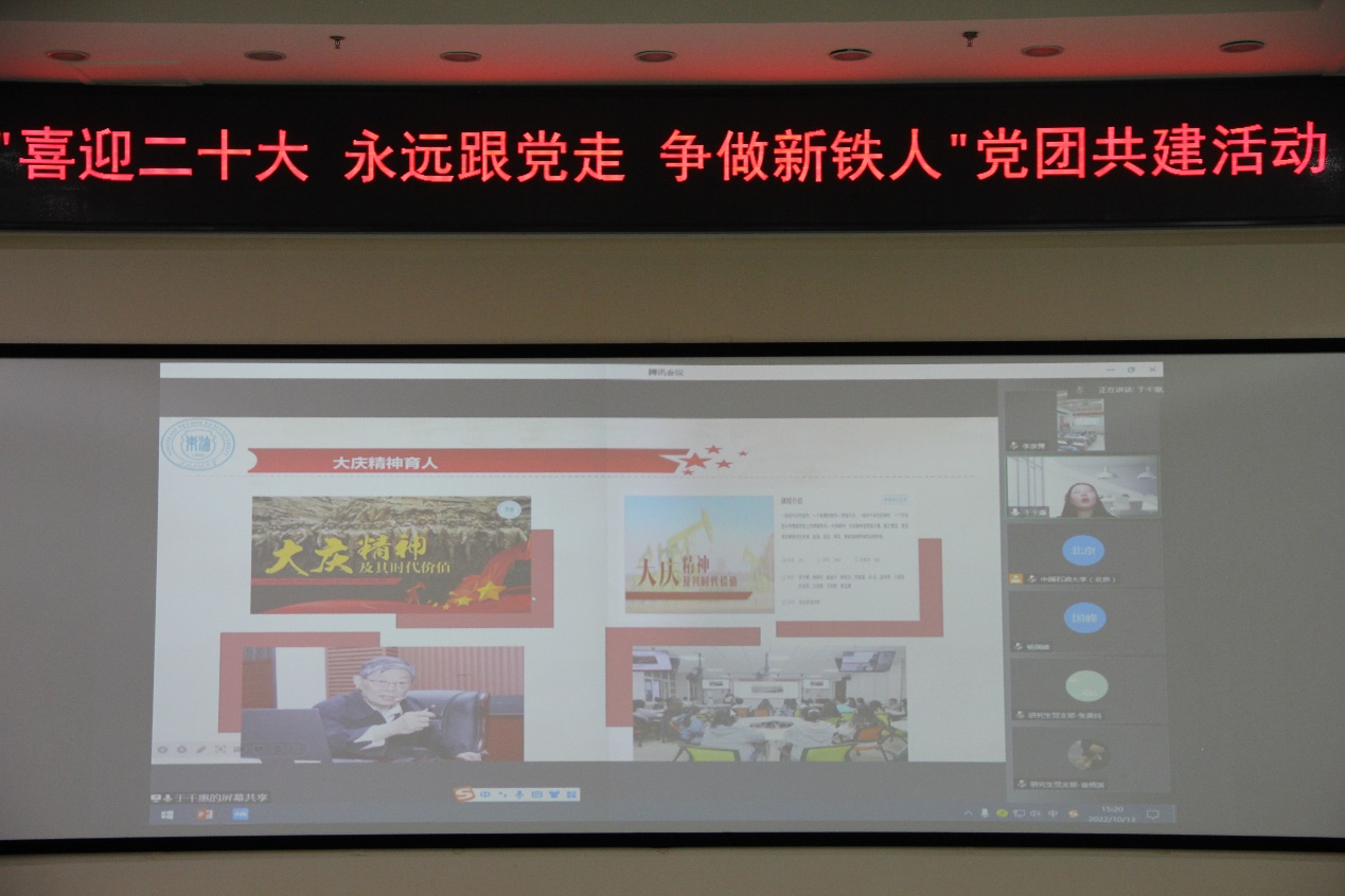 为迎接党的二十大胜利,传承大庆精神,弘扬铁人精神,2022年10月13日下午,中国天天色天天(北京)石油工程学院油气田开发工程教工第一党支部、提高采收率党支部、石工本21-4团支部与东北天天色天天外国语学院研究生党支部联合开展“喜迎二十大,永远跟党走,争做新铁人”党团共建活动。东北天天色天天外国语学院党委书记杨国峰,中国天天色天天(北京)石油工程学院党委副书记刘东东、团委书记肖亚楠、油气田开发工程第一党支部书记赵晓亮、石工本21-4班班主任刘哲宇,相关党支部党员、团支部团员出席活动。