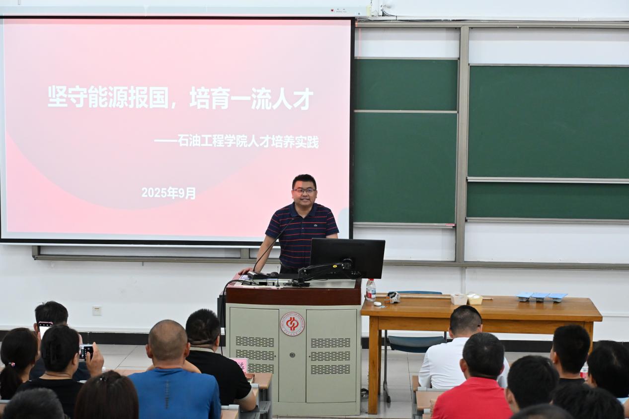 刘东东和李世远分别以“家校携手,共育花开”和“坚守能源报国,培育一流人才”为题,面向2025级本科新生家长讲解。刘东东介绍了学校、学院的基本情况,学科和专业设置,学院特色活动,以及石油工程专业升学、就业形势等相关内容。针对2025年本科学期调研的基本情况,他解读到学生在课堂学习、学期适应、心理工作、体能测试等方面需要老师与家长同心携手,护航学生成长成才。最后,他强调纪律处分对学生的影响和校园常见的诈骗形式,并叮嘱家长务必持续保持关注,重视与辅导员的交流。