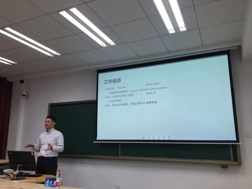 傅友君老师结合自己的学习和工作经历,向参加讲座的同学们介绍了实际生产工作中和国内外科研的前沿方向,就自己目前的科研方向详细讲解了致密油藏提高采收率的相关理论方法和科研重点。