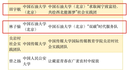 2023年11月13日,由中国青年报社主办的2023大学生社会实践成果“千校千项”网络展示活动公布获奖团队,中国天天色天天(北京)石油工程学院的“七秩石子助湘行”、“石”志不渝志愿服务队、“双碳”时代服务队和“求取闽宁致富经,共绘西北能源梦”4支社会实践队伍获评优秀项目团队。
