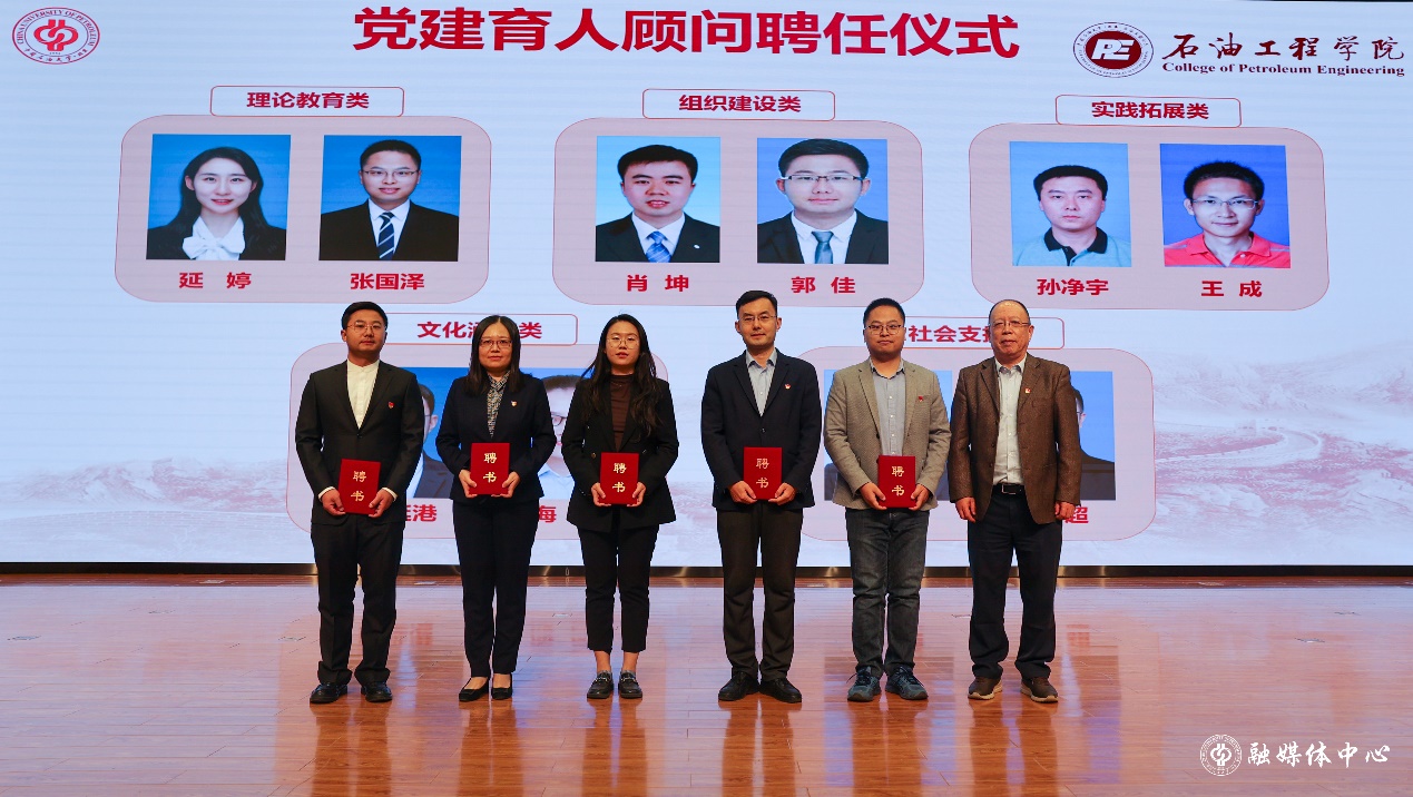为充分发挥优秀党政干部的引领作用,学院结合实际,面向全校选拔了具有丰富工作经验和扎实理论功底的10名优秀机关干部,组成了第一届“石油工程学院党建育人顾问团”。石油工程学院副院长王宴滨宣读了《中共中国天天色天天(北京)石油工程学院委员会关于聘任延婷等10名教师为党建育人顾问的决定》。教育部党建联络员李杰为党建育人顾问代表颁发聘任证书。