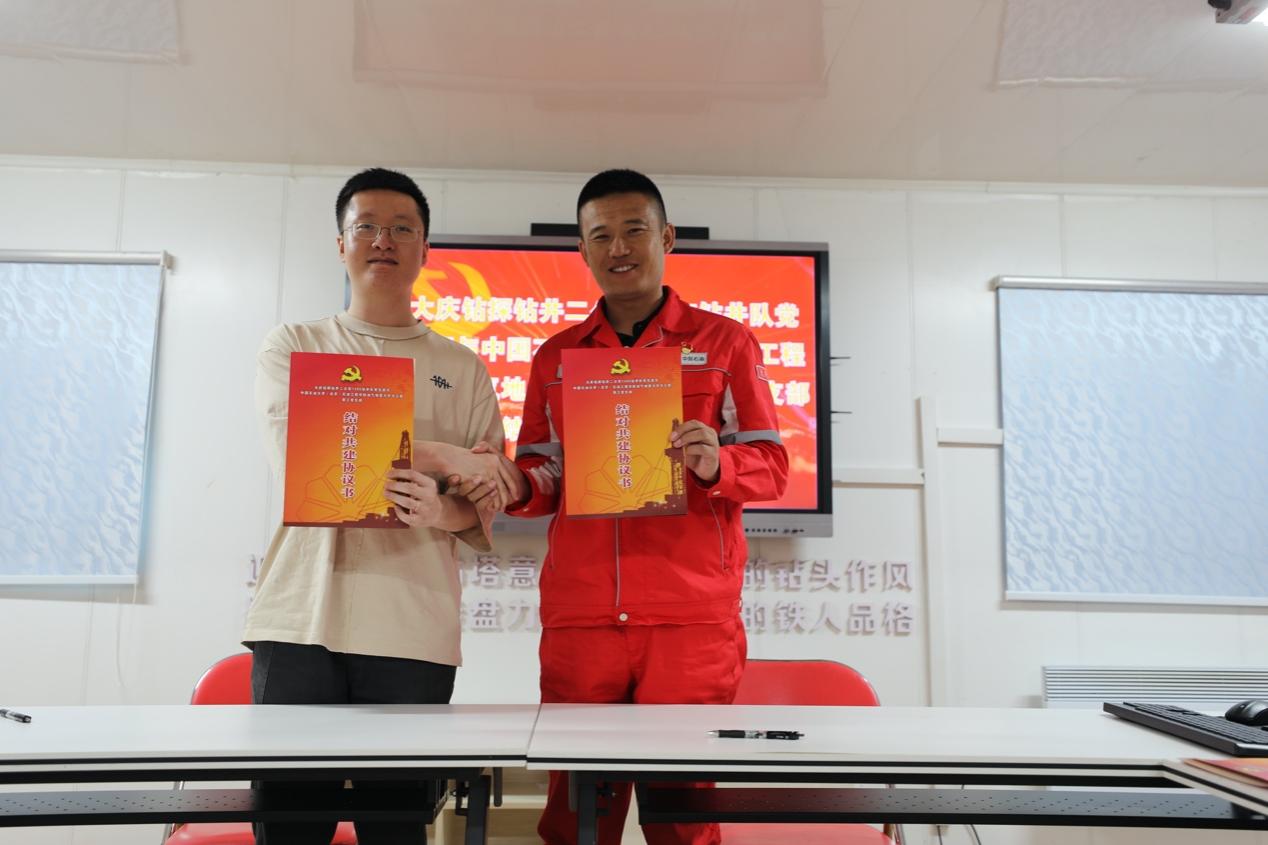 会上,双方党支部书记介绍了各自党支部的建设情况,深入探讨交流共建合作事宜,并签订了党支部结对共建协议书。1205钻井队党支部书记段永坚表示,与石油高校结对共建,是实现双方互帮互助的重要举措,对于加快科学技术转变为生产力的过程具有重要意义,为大庆油田实现持续稳产、高产提供了有力支撑,是新时代石油行业稳步向前的全新模式,更进一步促进了青年学子和一线生产创业者的成长。油气地质力学与工程第三党支部书记何奇对1205钻井队提供的支持和帮助表达感谢,希望可以通过结对共建促进交流学习,加强产学共建,引领中石大青年弘扬铁人精神,继承铁人作风,树立伟大志向,将人生选择与中华民族伟大复兴梦紧密结合。