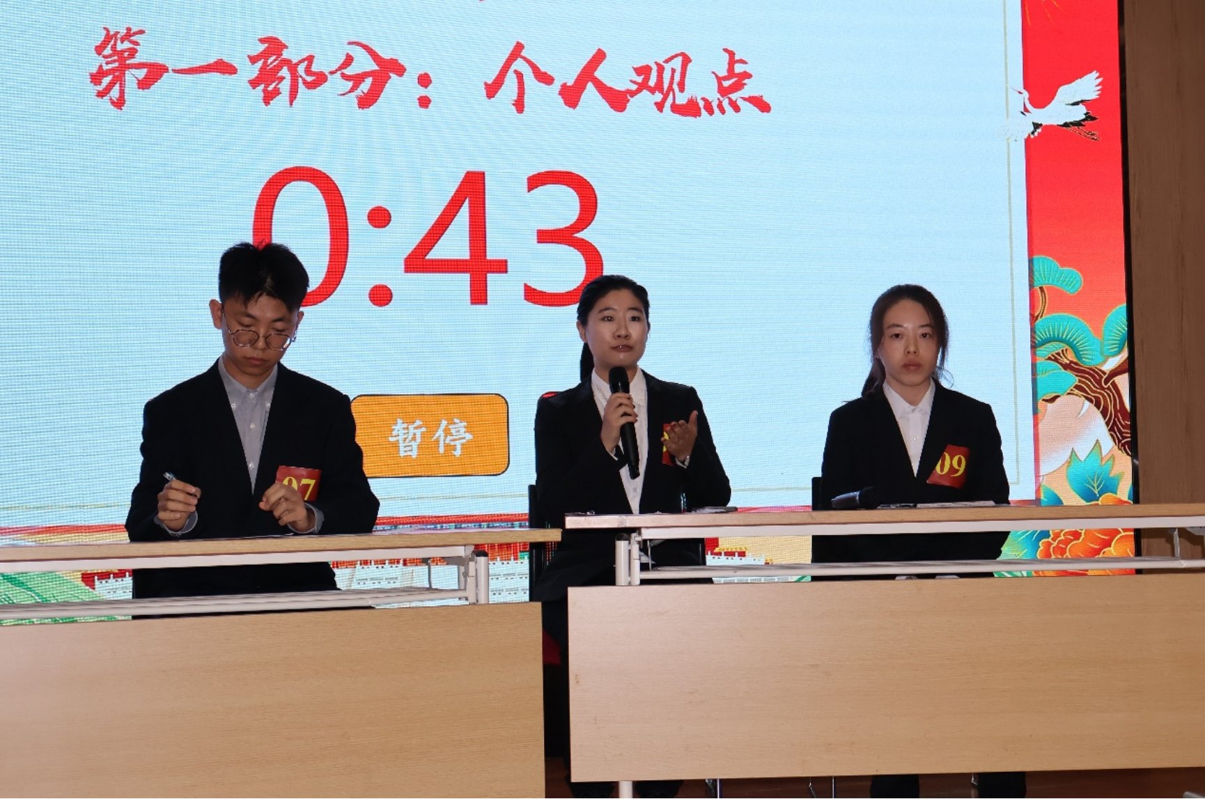 第一个环节为“风采展示”。各位选手在规定的三分钟时间内,以教育经历、素质能力、岗位认知、荣誉奖励为内容,向评委进行风采展示。9位选手得体的仪容仪表、流畅的表达能力、深厚的文化素养获得了评委的一致认可,赢得了观赛同学的阵阵掌声。