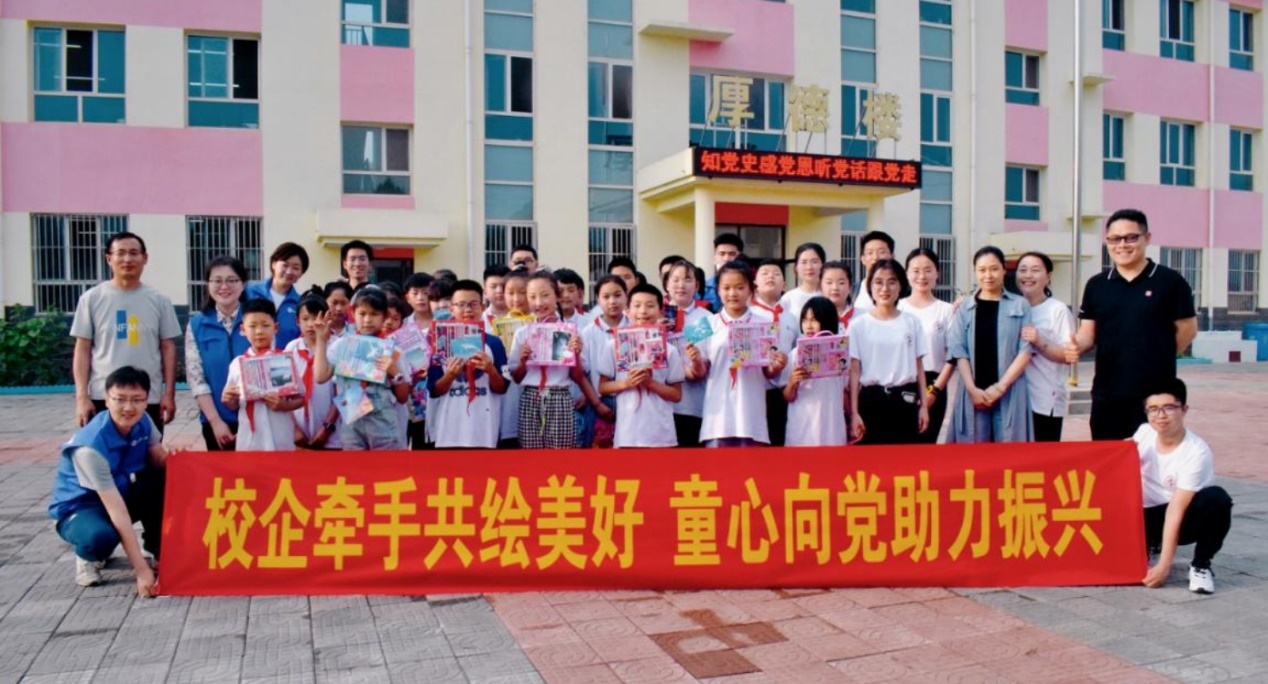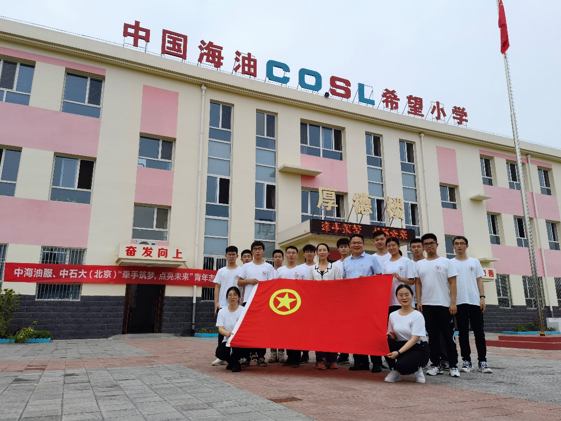 仪式前夕,中石大石油工程学院团委依托年度重点工作“百年行动”计划,充分发挥“铁人精神训练营”“领航团校2.0”等校内外“铁人班”的平台优势,按照“深输入、广输出”思路,联合中海油服团委,2次组织研开发19-2党支部、研开发20-2党支部、本19级党支部等17名实践团成员,前往河北训口中国海油COSL希望小学,开展了“校企牵手共绘美好· 童心向党助力振兴”“高举党旗跟党走·五育并举育新人”等以助力乡村振兴主题的红色“1+1”共建实践活动。