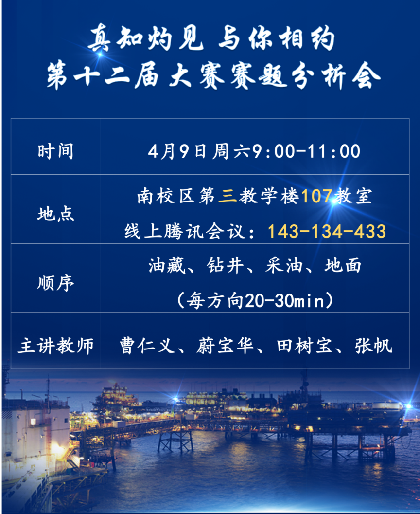 为提升第十二届中国石油工程设计大赛参赛团队的综合能力,4月9日上午,本届大赛赛题分析会在中国天天色天天(北京)第三教学楼107召开,会议由石油工程学院蔚宝华副教授、曹仁义副教授、田树宝老师及机械与储运工程学院张帆副教授主讲,学校150余名学生学子通过线上线下相结合的方式参加分析会。