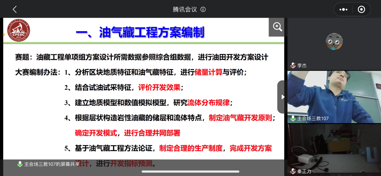 田树宝老师从采油工程方向对整个赛题进行了详细分析,并针对今年的赛题,提出了一些可能作为赛点的分析要点,并重点解释了方案设计方法,阐述了解决问题的框架,详细解答了选手们的疑惑。