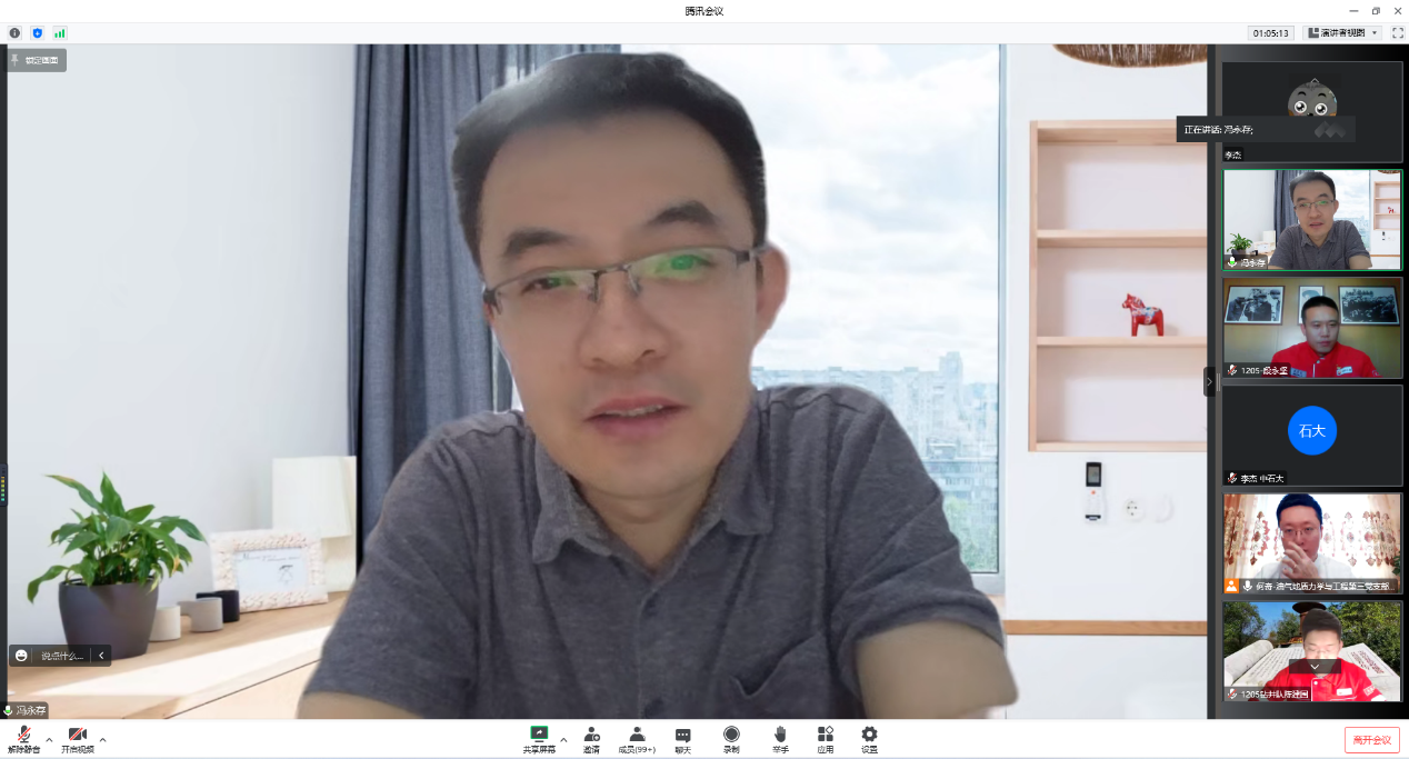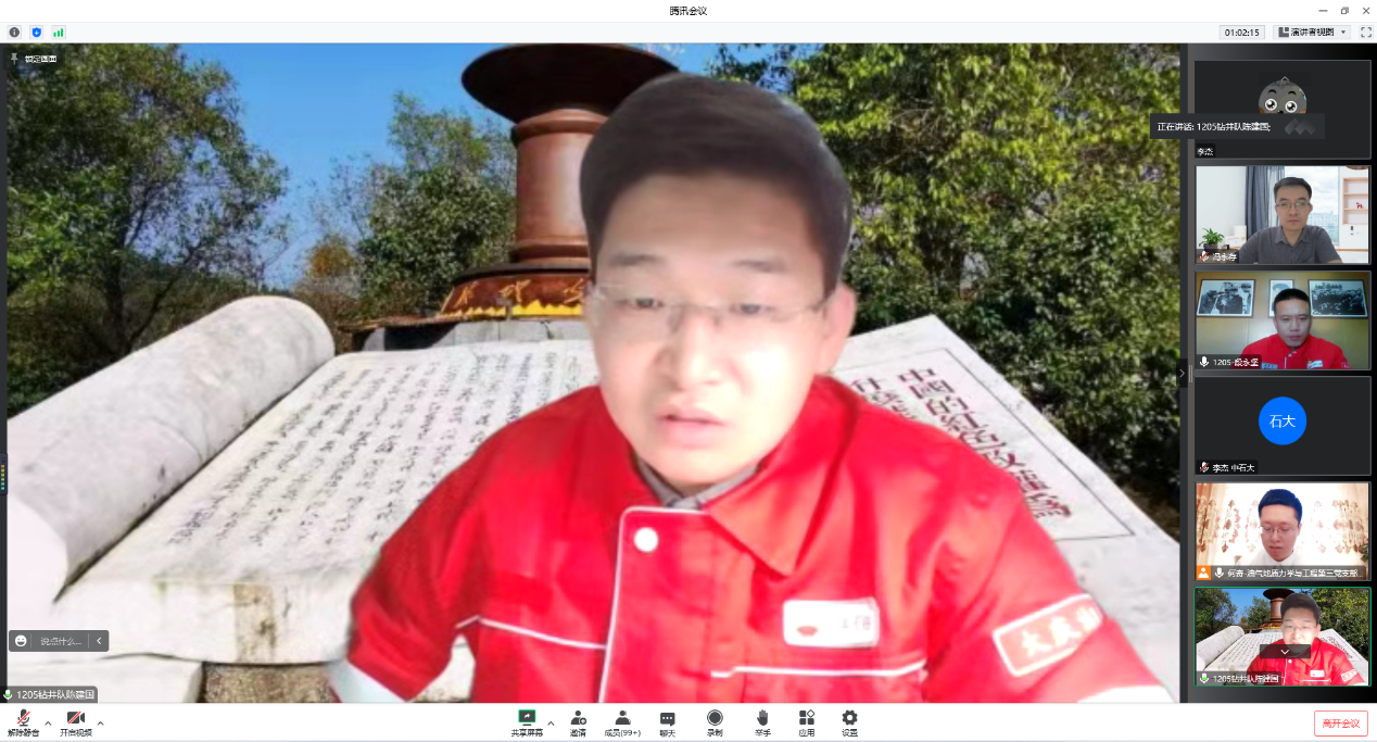油气地质力学与工程第三党支部思想导师冯永存作总结讲话,他首先对两位校友线上回访母校表示感谢。他表示铁人精神是一种力量,在任何时代,任何地点都需要继承与弘扬铁人精神,希望能够通过两个党支部的结对共建,以铁人精神为核心,进一步推进“产”“学”“研”“用”深度融合,从而实现校企双赢。