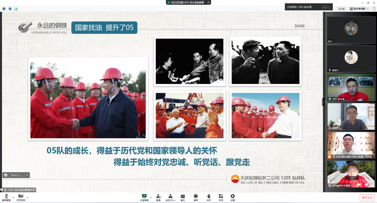 段永坚以“铁人精神,永不磨灭的丰碑”为主题作分享。他以1205钻井队献礼建党百年的宣传片为切入点,让参会师生了解钢铁1205钻井队的发展历程,围绕“铁人精神+”支部建设、队伍建设、主题教育等几方面,通过珍贵的档案图片和现场图片,用朴实的语言讲述介绍了1205钻井队的发展经验、党建工作和业务工作深度融合等方面的特色做法和经验。他表示,1205钻井队将始终牢记习近平总书记的殷切嘱托,永远听党话、跟党走,高唱“我为祖国献石油”主旋律,坚定传承大庆精神、铁人精神,用新时代大庆石油人的忠诚和担当,向党和人民交上一份满意的答卷。
