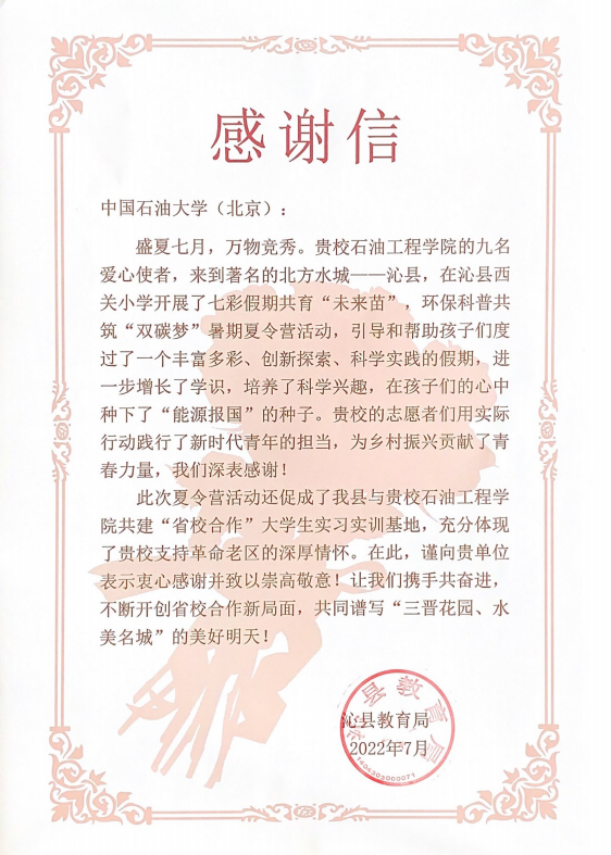 近日,长治市沁县教育局向中石大发来感谢信,对中石大石油工程学院在暑期组织志愿者赴沁县西关小学开展七彩假期共育“未来苗”,环保科普共筑“双碳梦”暑期夏令营活动表示感谢。