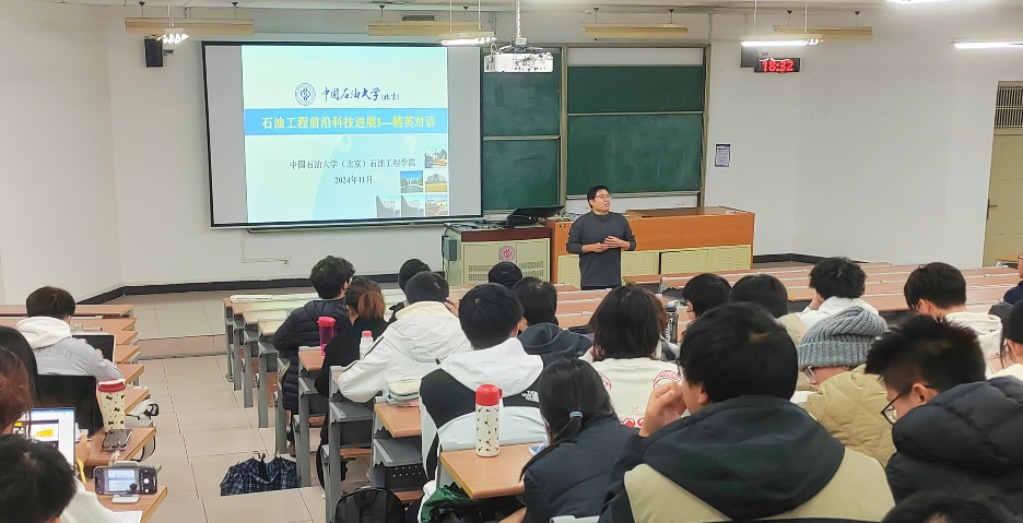 芮振华教授的题目是《二氧化碳捕集、利用与封存现状与展望》,介绍了自己所带领的研究团队在CCUS方面的前沿工作,并与在场学生积极互动,回答学生关心的问题。王敬教授的题目是《复杂及非常规油气藏开发理论与技术挑战》,作为曾分管本科教学的副院长,他介绍了该课程设置的背景和思考,引导学生关注前沿并积极投身专业研究。于海洋教授的题目是《页岩/致密油气开发现状与技术》,结合自己的专业成长经历,鼓励学生把石油工程专业作为个人职业生涯的无悔选择。吴克柳教授的题目是《非常规油气藏开发技术进展与展望》,并介绍了自己海外学习和科研的体会。张媌教授的题目是《氢能利用及地下储氢研究进展》,介绍了地下多孔介质渗流理论与数学模拟,描绘了地下储能的光明前景。王宴滨教授的题目是《深水钻井工程技术进展与主要挑战》,带领学生把钻井工程的学习和研究视野推向深蓝。卢运虎教授的题目是《非常规油气革命下岩石力学的使命与创新探索》,引导学生进入万米井深、传承应用力学的根脉。宋先知教授的题目是《钻完井工程与人工智能》,让学生身临其境地感受到人工智能在钻完井工程的高效应用,展现了智能学科交叉带来的勃勃生机。作为学院院长,他还勉励同学们打下扎实的专业基础,成为石工学科和行业的后备人才。