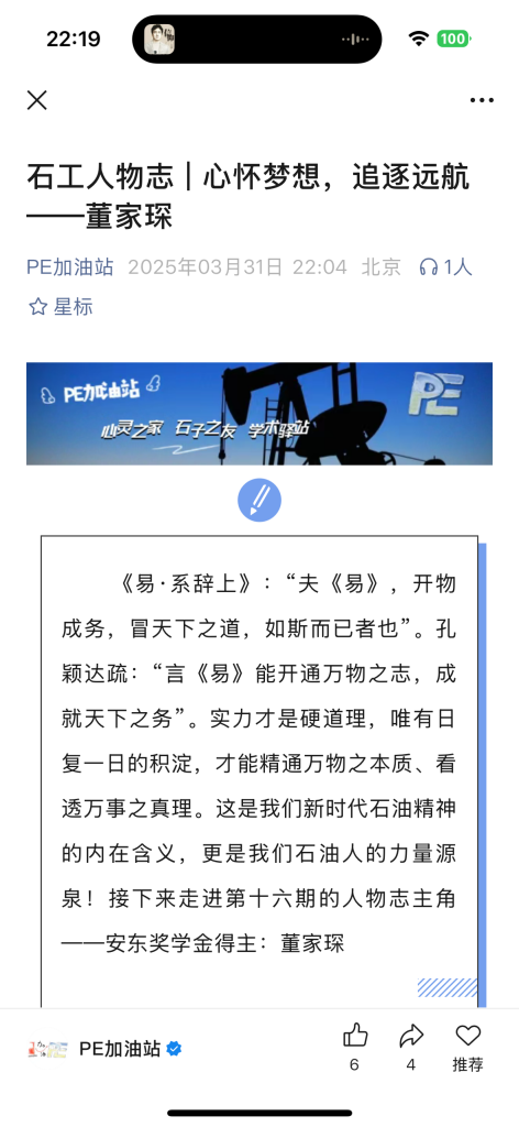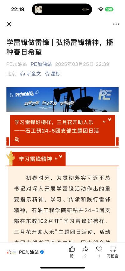 学院以宣讲筑牢思想根基,用观影践行使命担当,借“专栏开辟”营造浓厚氛围,掀起全院追“锋”热潮,引导广大青年学子在志愿服务中淬炼青春、奉献社会。在“雷锋纪念日”当天,发布“石小志”IP形象及志愿者服装,通过视觉元素的创新,展现学院志愿者的风采。邀请全国三八红旗手李淑芳为学生讲述带领周边妇女一起勤劳致富的故事,激发广大学子爱岗敬业、奋勇争先的工作热情。精心筹办“百年征程杯”微团课大赛,12名团支书以真挚话语讲述时代故事,以赤诚之心传递青年担当。院研究生会、石工本24-1团支部创新“领学+研学+践学”三维模式,以“理论研习筑牢信仰根基、热点研讨凝聚思想共识、实践赋能彰显青春担当”为主线,组织开展全国两会精神读书班活动。水射流第三党支部、研钻井24-5团支部、石工本23-4班等党团班多形式观看雷锋事迹专题片、宣讲新时代雷锋故事,共同深刻领悟雷锋精神的历史意义与当代价值。油藏工程党支部、油气井力学与控制工程第二党支部、石工本23-1班赴中国石油勘探开发研究院参观学习,深入了解我国石油勘探领域核心技术突破历程与智能化转型成果。学院开辟“学雷锋做雷锋”“我们的志愿故事”宣传专栏,持续报道典型事迹、品牌活动等推文53篇,阅读总量超15000人次,积极营造学院“人人学雷锋,处处有雷锋”良好氛围。