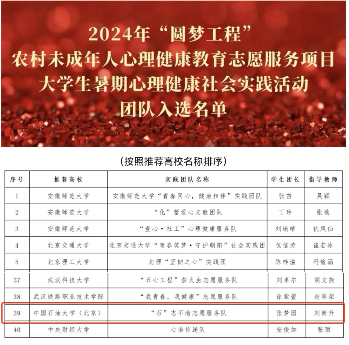 近日,由中央宣传部文明培育局、中国社会工作联合会共同开展2024年“圆梦工程”农村未成年人心理健康教育志愿服务项目大学生暑期心理健康社会实践活动入选团队名单揭晓。学院“石”志不渝志愿服务队成功入选。