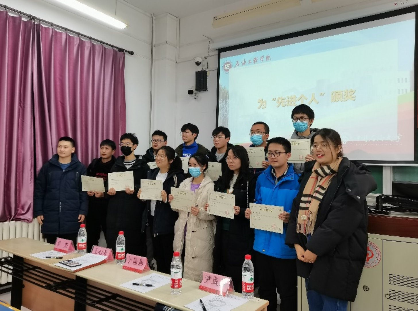 王心贺老师和卜晶晶老师分别为本年度书香石工活动中荣获“先进个人”和“读书之星”的同学们颁奖,并合影留念。获得“先进个人”称号的同学领取青马社石光工作室准备的“盲盒图书”作为纪念。