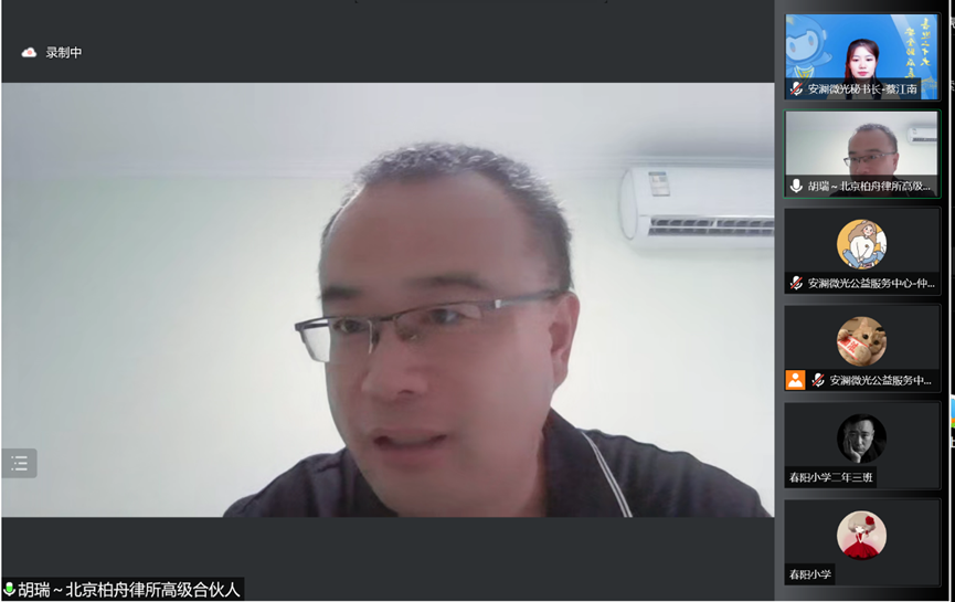 安澜微光法律顾问、2020年度北京“七五”普法先进典型、北京柏舟律师事务所高级合伙人胡瑞律师以“普法育未来,安全助成长”为题,讲解了在遭遇违法犯罪时应该如何自我保护,并着重分享了在当下的疫情防控中,青少年应有的安全意识和法治意识。