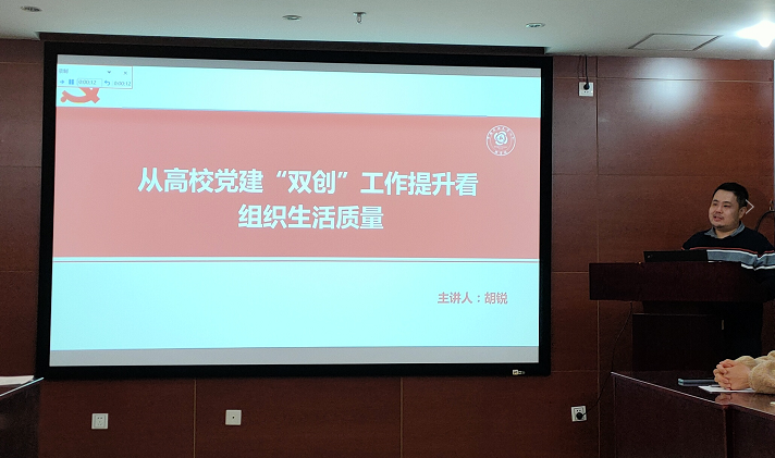 会上,胡锐作“从高校党建“双创”工作提升看组织生活质量”主题分享交流,从党支部基本任务和组织生活的历史脉络为切入点,从学、讲、践三个方面分享组织生活内容、形式、质量提升和成果固化等方面分享成功做法,对学生党支部组织生活的政治站位、活动覆盖面、实际效果和创新性提出建议,并解读了《第三批新时代高校党建“双创”工作重点任务指南(基层党支部)》。