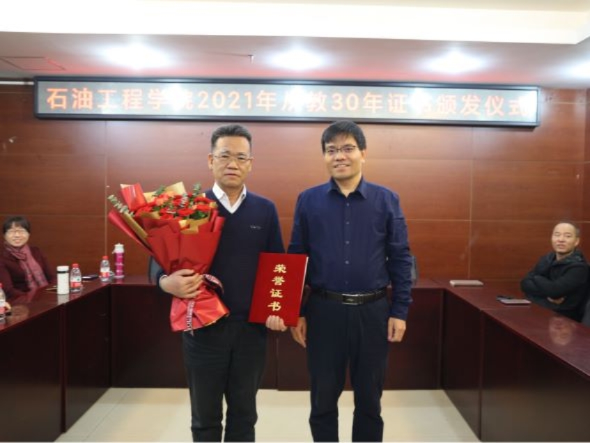 12月21日下午,石油工程学院2021年从教三十年证书颁发仪式在中油大厦A座310会议室成功举办。石油工程学院党委书记黄世军,宁正福教授、刘慧卿教授及十余名教师代表出席此次活动,本次证书颁发仪式由副院长兼工会主席王敬主持。