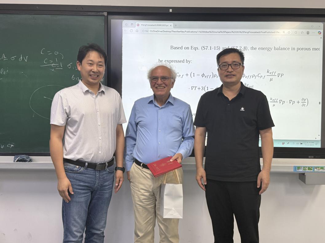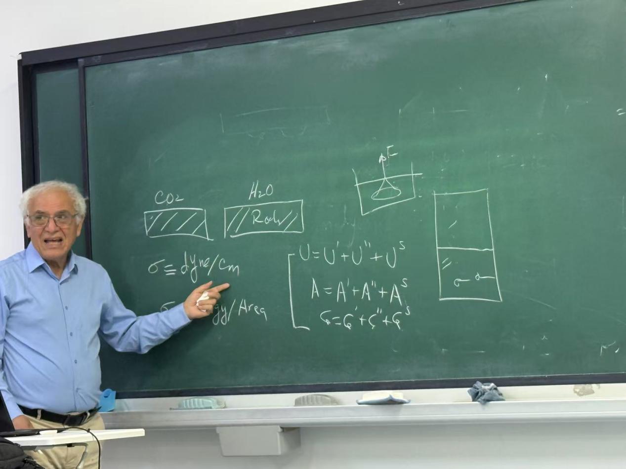 Firoozabadi教授系统阐释了体相与界面热力学及其在地下流体流动与热能开采中的应用理论体系。首日课程聚焦热力学基础与相态演化,Firoozabadi教授通过严谨的公式推导,结合《油气藏热力学》教材和相关学术论文,解析重力场与毛细管力场耦合作用下的三相平衡机制。次日课程深入工程实践核心,Firoozabadi教授以状态方程为例,强调闪蒸计算在碳封存设计中的关键作用,并同步关联教材内容强化理解。第三日课程转向学科前沿,Firoozabadi教授通过相场法动态模型展示裂缝扩展机理,揭示界面张力与线张力对压裂液行为的控制规律。Hossein Hejazi教授的压轴报告呈现了重油开采技术突破,通过高温高压微观实验影像,直观展示高温乳化剂诱导的原位油包水乳液在岩石孔隙中的流动特性,结合界面流变学数据定量解析剪切应力对液滴断裂的调控机制,为重油开采提供了全新解决方案。课程间隙,聆听课程的同学和老师与Firoozabadi教授、Hossein Hejazi教授深入交流探讨,启发新的研究思路。