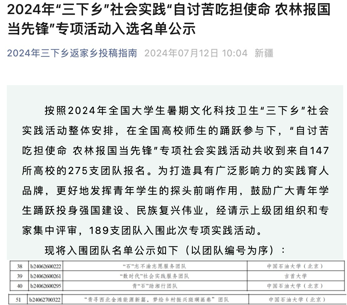 近日,由全国农林高校共青团工作联盟主办的2024年全国大学生暑期“三下乡”社会实践“自讨苦吃担使命 农林报国当先锋”专项活动入选名单揭晓。学院“石”志不渝志愿服务队、青“石”助湘行实践团、“青寻西北金滩能源新篇 梦绘乡村振兴斑斓画卷”实践团3支团队成功入选。