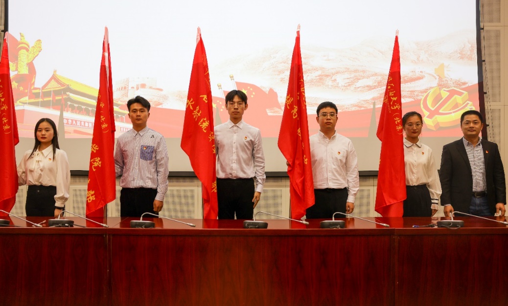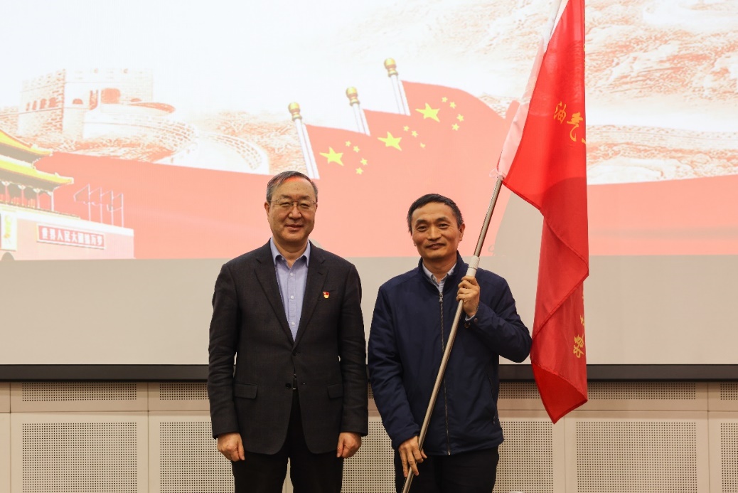 陈峰为油气工程力学师生联合党支部联合党支部书记张广清授旗。学生工作部部长庄玉琳为研究生“功能型”党支部书记代表授旗。