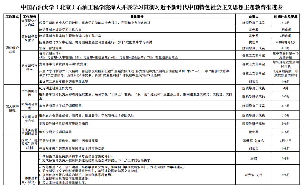 学校党委牢牢把握主题主线,第一时间成立领导小组、制定实施方案,加强对主题教育的顶层设计。学院成立以学院党委书记为组长、领导班子成员任副组长的领导小组,加强组织领导,形成齐抓共管合力,为主题教育各项任务扎实推进提供坚强有力的组织保障。学院对标对表主题教育工作要求,制定《石油工程学院学习贯彻习近平新时代中国特色社会主义思想主题教育理论学习方案》《石油工程学院党委理论学习中心组主题教育读书班学习方案》,对学院主题教育一体谋划、一体部署,并制定施工图和推进表,坚持对单落实、挂图作战,确保主题教育扎实推进。