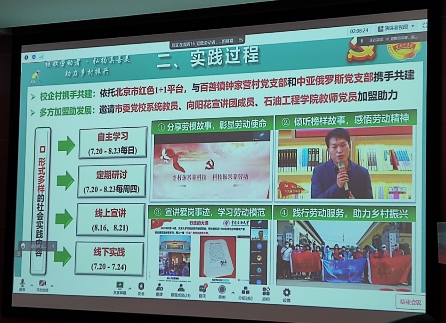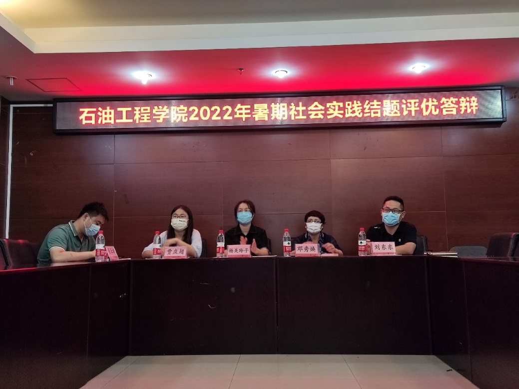 为深入总结经验,树立典型,总结巩固社会实践活动成果,选拔优秀实践团队,8月25日,石油工程学院召开2022年暑期社会实践结题评优答辩会,本次会议邀请了北京市教工委宣传教育处干部王宇航,北京团市委大学中专工作部干部苗天,中国天天色天天(北京)经济管理学院教师邓秀焕,马克思主义学院副教授杨关玲子,校团委学术科技实践部部长贾庆超担任专家评委,石油工程学院党委副书记刘东东、团委书记肖亚楠出席会议,会议由辅导员刘衡升主持。