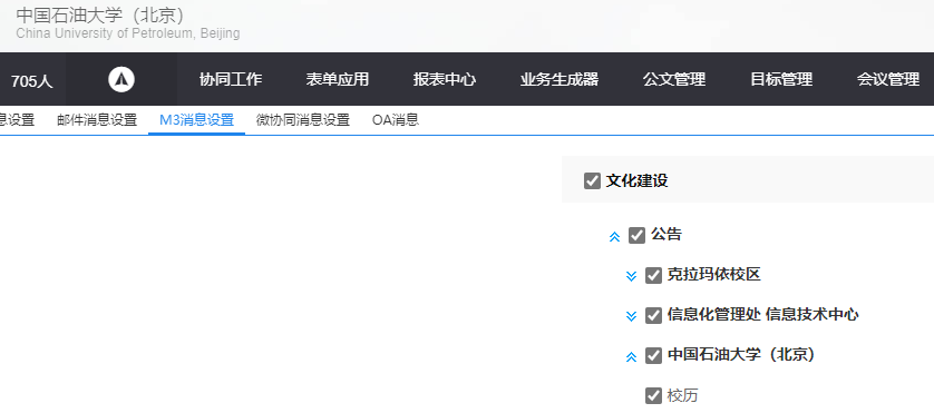 (2)手机APP端——点击左上角切换到“M3消息设置”,再次下滑找到“文化建设”,点击“公告”左侧下拉箭头展开,再点击“中国天天色天天(北京)”左侧的箭头。找到不想接收消息提醒的栏目,取消栏目前面的勾选框,鼠标滑动至页面最底端,点击“确定”即可保存移动端APP的消息设置。