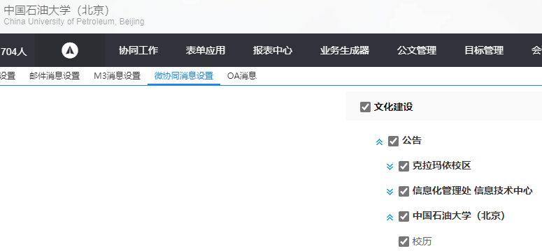 (3)微信企业号“微协同”端—— 点击左上角切换到“微协同消息设置”,再次下滑找到“文化建设”,点击“公告”左侧下拉箭头展开,再点击“中国天天色天天(北京)”左侧的箭头。找到不想接收消息提醒的栏目,取消栏目前面的勾选框,鼠标滑动至页面最底端,点击“确定”即可保存针对微信端微协同的消息设置。