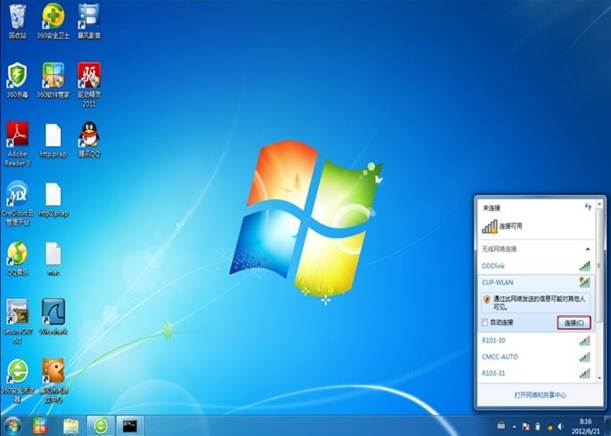 ×ó¼üµã»÷×ÀÃæÓÒϽÇÍøÂçÁ¬½Óͼ±ê»áµ¯³öÍøÂçÁ¬½Ó´°¿Ú£¬´Ó´°¿ÚÁбíÖÐÑ¡ÔñÎÞÏßÍøÂçÃû“CUP-WLAN”µã»÷Á¬½Ó£¬µÈ´ýÁ¬½Ó³É¹¦¡£