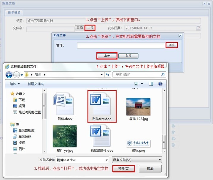 3.°´²½Öèµã»÷“ÉÏ´«”→“ä¯ÀÀ”£¬ÔÚ±¾»úÉÏÕÒµ½ÐèÒªÌṩÏÂÔØµÄÎĵµ£¬µã»÷“´ò¿ª”£¬×îºóµã»÷“ÉÏ´«”£¬½«ÐèÒªÏÂÔØµÄÎļþÉÏ´«ÖÁ·þÎñÆ÷£º
