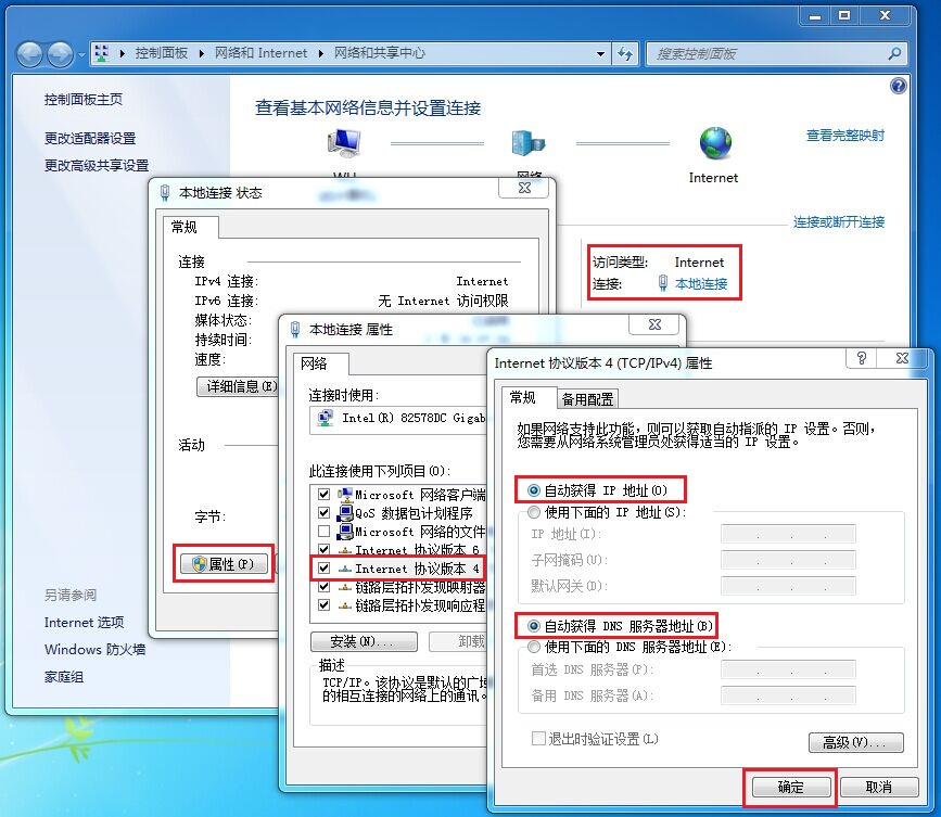 µã»÷ÓÒϽÇÍøÂçÁ¬½Óͼ±êÑ¡Ôñ“´ò¿ªÍøÂçºÍ¹²ÏíÖÐÐÄ”£¬Ñ¡Ôñ“±¾µØÁ¬½Ó”Íø¿¨£¬ÔÚµ¯³öµÄ´°¿ÚÖеã»÷“ÊôÐÔ”£¬ÔÙË«»÷“InternetÐÒé°æ±¾4”£¬ÔÚµ¯³öµÄ´°¿ÚÖÐÅäÖÓ×Ô¶¯»ñÈ¡IPµØÖ·”ºÍ“×Ô¶¯»ñÈ¡DNS·þÎñÆ÷µØÖ·”Á¬Ðøµã»÷“È·¶¨”°´Å¥£¬ÈçÏÂͼËùʾ£º