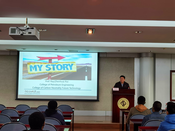 On October 28, 2021, the teacher-student exchange meeting for graduate students of CUPB was held in conference room 306 of the international exchange center. Professor Rui Zhenhua, a famous teacher of the Department of oil and gas field development engineering of the College of Petroleum Engineering, was specially invited to the exchange meeting to talk about life, ideals, scientific research and development. Liu Xiaoqing, vice Dean of The College of International Education, and more than 60 international students were invited to attend the meeting.
