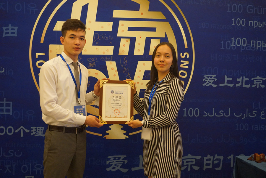In this competition, our school's Turkmenistan undergraduate student SEYTEKOV AGAREJEP and Ukrainian undergraduate student VAN ALINA's work "Alina's Day in Beijing" won the third prize. In this work, two international students visited the Olympic Forest Park, the Center of Chinese Studies, Beihai Park, China International Trade Center and other famous places in Beijing, showing the image of Beijing in the eyes of foreigners from both traditional and modern perspectives, expressing their love for China and Beijing.