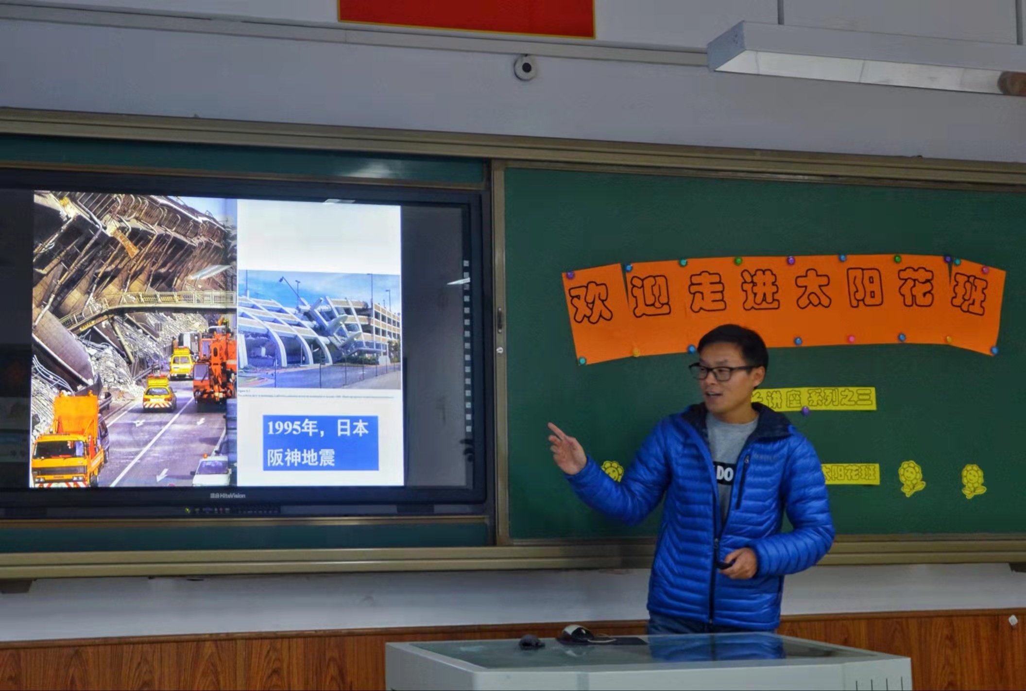“我们能够生活在这美丽的蓝色地球上,是无比幸福的,因为这里有高山、有海洋、有阳光、有鲜花,还有可爱的小动物们。但是,地球经过几十亿年的演化,有着复杂的地质结构,它有时候也会发泄“小脾气”——地震。你们了解地震吗?我们又该如何在地震来临时保护好自己呢?”讲堂伊始抛出两个问题,让学生们对此产生了浓厚的兴趣及引起积极的思考。接着罗泽熙爸爸用简单的语言及生动的视频诠释了什么是地震?地球就像是一个能量球,它的内部缓慢积累的能量突然释放就会引起地球表面的震动,震源深度浅、震级高的地震会给人类带来很大的伤害。