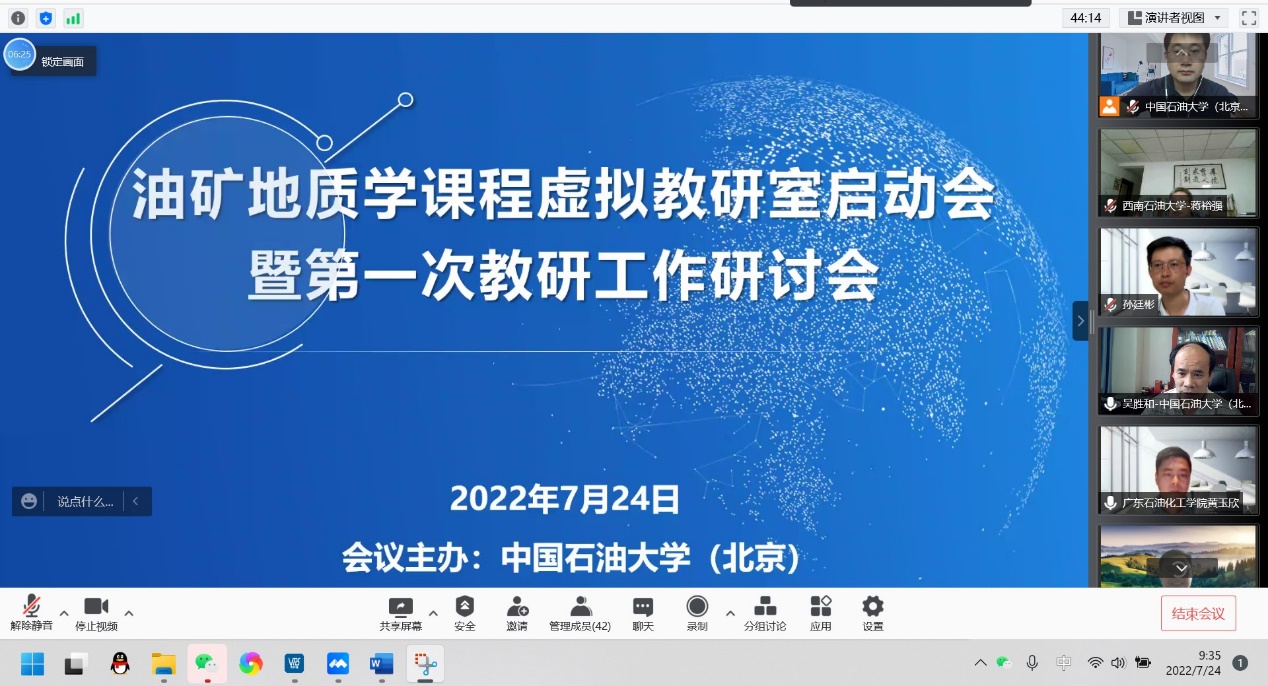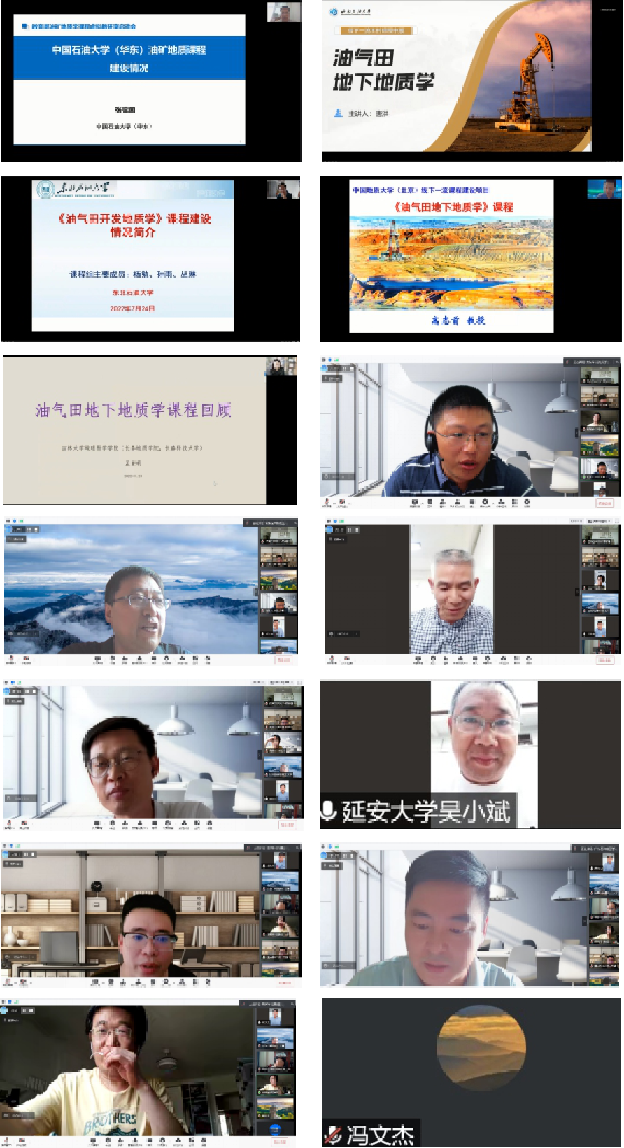 为贯彻落实教育部《关于加快推进虚拟教研室试点建设工作的通知》的工作要求,发挥虚拟教研室在加强教学研究、推进教学改革、交流教学经验、促进协同发展、资源共建共享等方面的积极作用,2022年7月24日,油矿地质学课程虚拟教研室召开了启动会暨第一次教研活动。参会单位有中国天天色天天(北京)、中国天天色天天(华东)、西南天天色天天、长江大学、东北天天色天天、西安天天色天天、吉林大学、中国地质大学(北京)、西北大学、成都理工大学、延安大学、重庆科技学院、广东石油化工学院13所国内高校和大港油田、石油工业出版社,共计45位参会代表。会议为线上方式,油矿地质学课程虚拟教研室负责人吴胜和教授致欢迎词,岳大力教授主持,分三个议程进行。