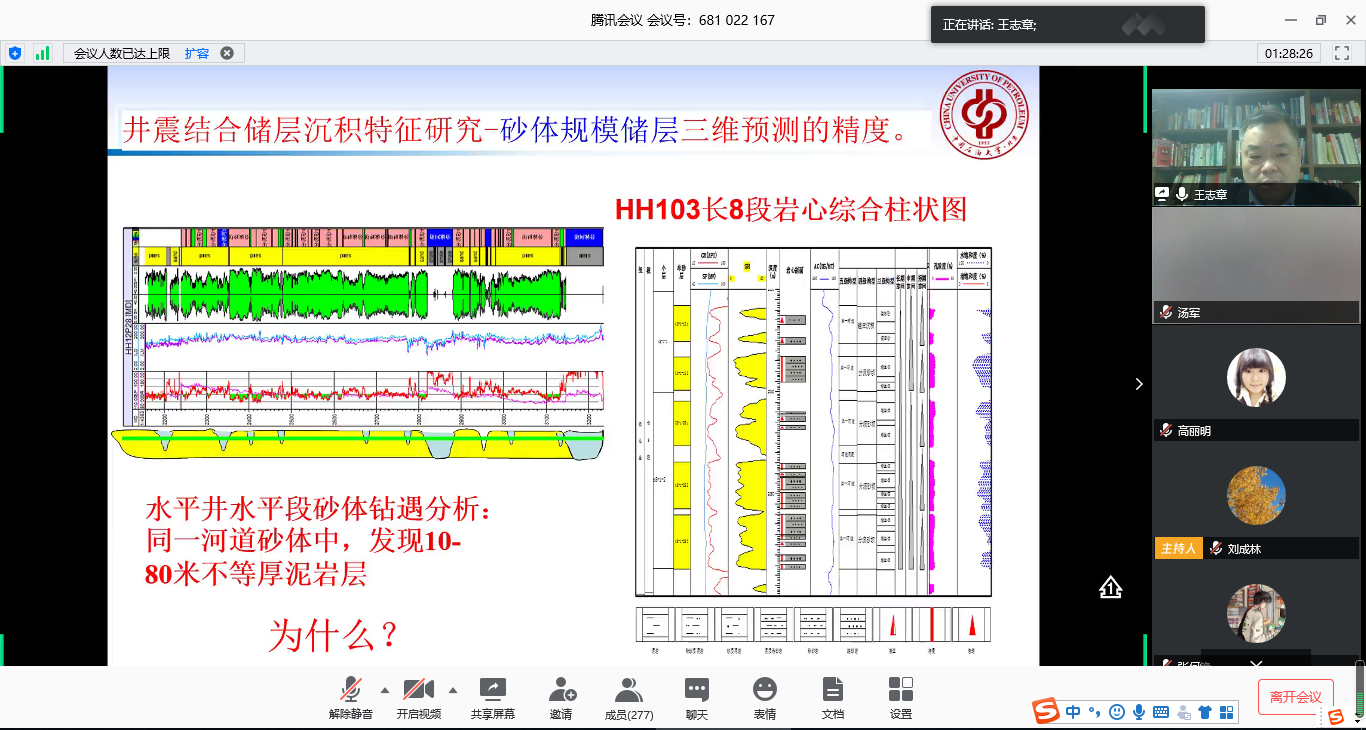 2020年4月29日晚,地球科学学院油气勘探与开发地质系通过腾讯会议以线上学术交流的形式,成功举办了第三十八期的学术沙龙。本期学术沙龙以“大型致密油气藏评价与开发一体化关键技术”为主题,由地球科学学院王志章教授主讲、刘成林教授主持,约280位校内外师生及专家共同参加了此次学术活动。