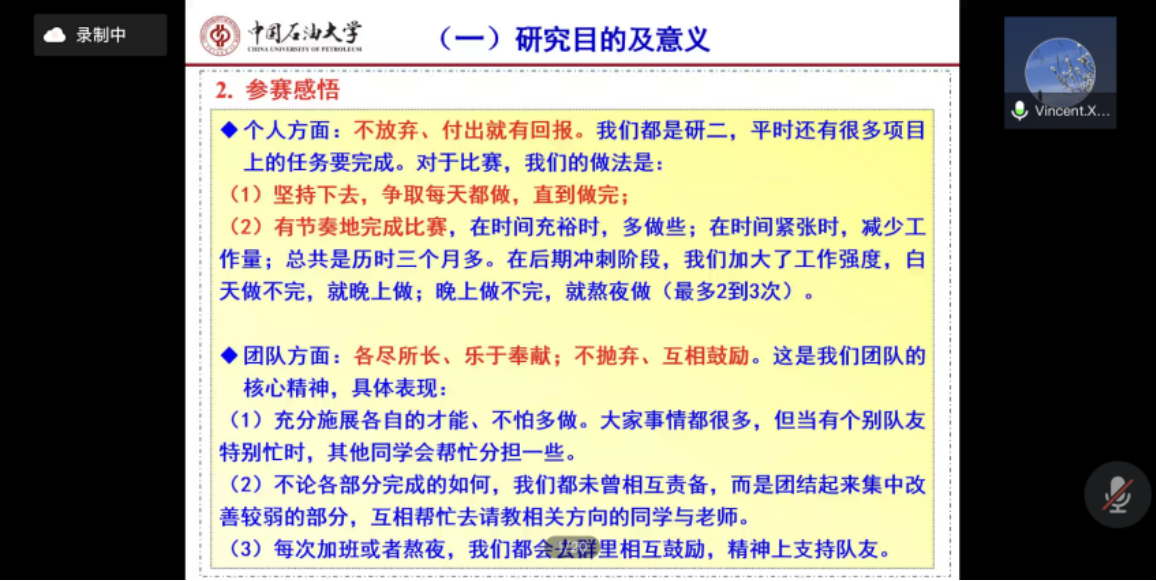 在往届参赛选手经验分享阶段,曾获得第四届油气地质大赛研究生综合组特等奖的张兴文和彭思桥为大家进行了参赛指点。张兴**调,整场比赛可分为两段进行,第一步首先完成整体框架,然后第二部分补上短板,突出团队核心亮点。这也是关键所在;彭思桥将沉积相分析部分比赛的各个阶段分别进行剖析,并强调文献调研方面要注意查找相关资料,同时也给大家推荐了经典文献,希望大家从中能够有所启发。两位学长在分享的最后阶段也不忘给了本次即将参赛的选手加油打气,希望全体参赛选手能够有节奏地完成比赛,发挥团队优势,各尽所长,互相鼓励,最终顺利拿下比赛。