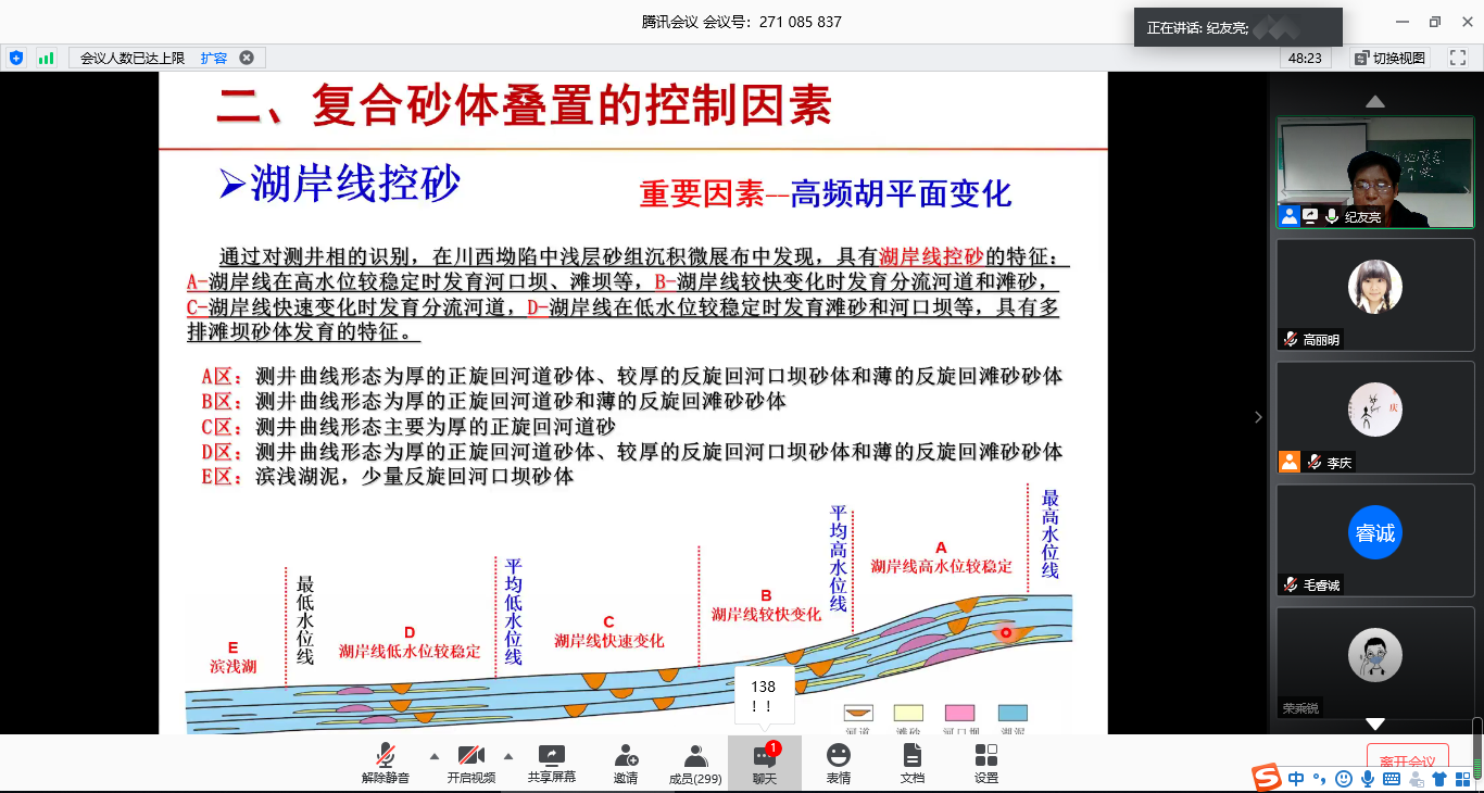 2020年5月7日晚,地球科学学院油气勘探与开发地质系通过腾讯会议以线上学术交流的形式,成功举办了第三十九期的学术沙龙。本期学术沙龙以“陆相湖盆复合砂体叠置模式、分布规律及控制因素——沉积相编图新方法探讨”为主题,由地球科学学院纪友亮教授主讲、李庆副教授主持,约300位校内外师生及专家共同参加了此次学术活动。