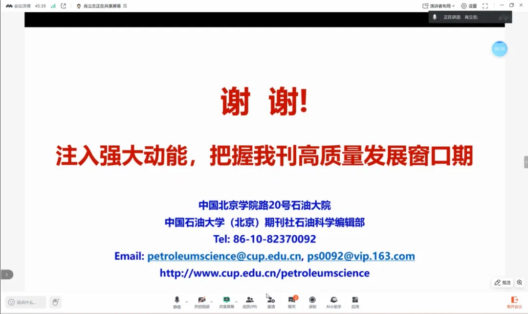 影响力可持续提升计划、完善稿件处理流程、特色化发展——抓住新兴前沿热点领域、高质量稿源——主动为高水平科研团队服务。肖立志强调,Petroleum Scie-