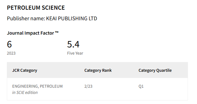 2024年6月20日,Clarivate Analytics发布了2023年度《期刊引证报告》(Journal Citation Reports, JCR),Petroleum Science 影响因子(IF)6.0!相比去年上涨7%,在发文量大幅增加的情况下,影响因子仍然保持了稳步增长,位居SCI收录的23种石油工程类学术期刊第2位,位于Q1区;总被引频次5330次,相比去年上涨24.8%。