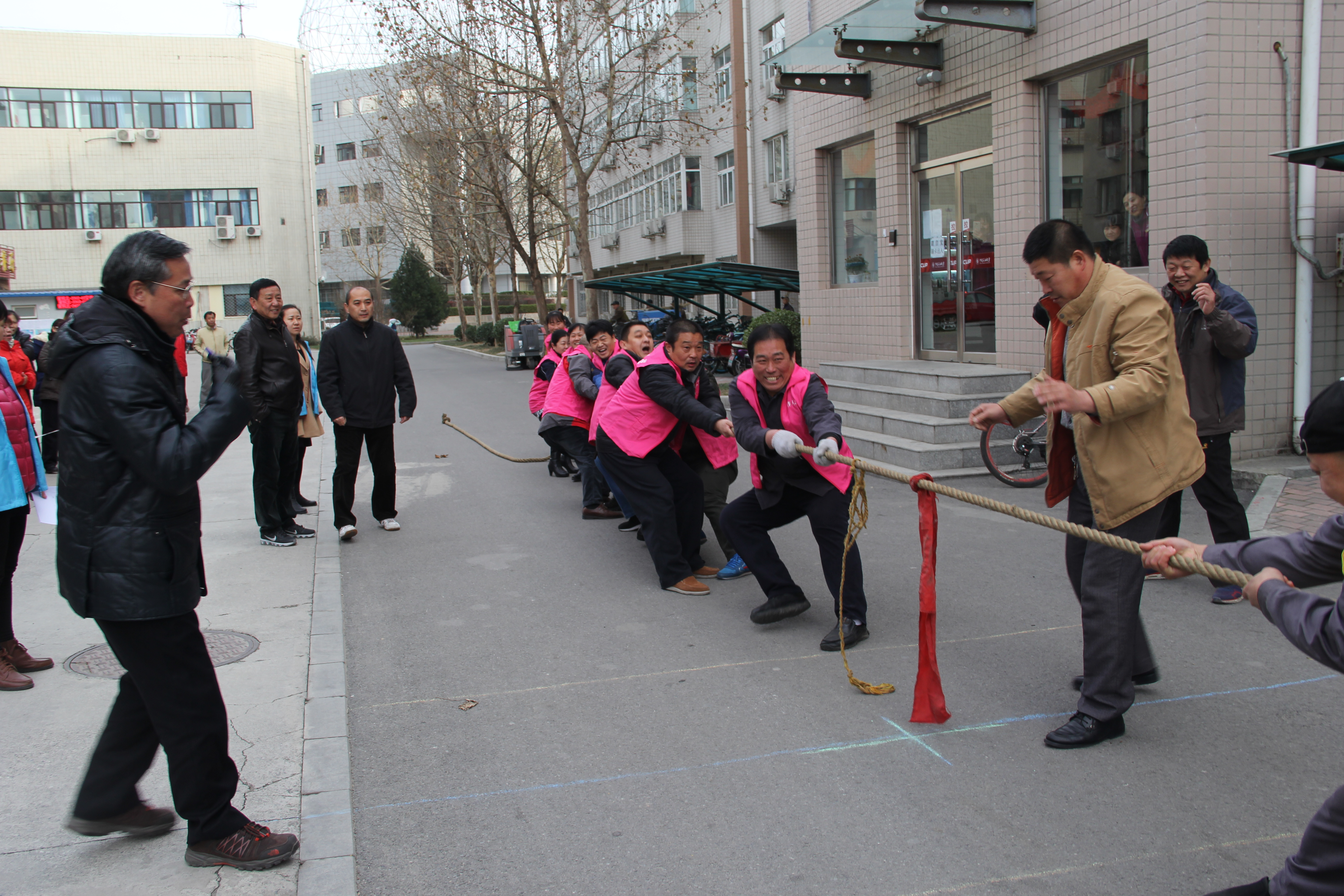 12月9日下午,由后勤工会主办、动力维修公司承办的员工拔河比赛在管院公寓南侧空地举办,来自各工会小组的7支代表队参与了角逐。每支队伍由7男3女组成,比赛分三轮,按各队代表抽签决定比赛对手和顺序,一局定胜负。