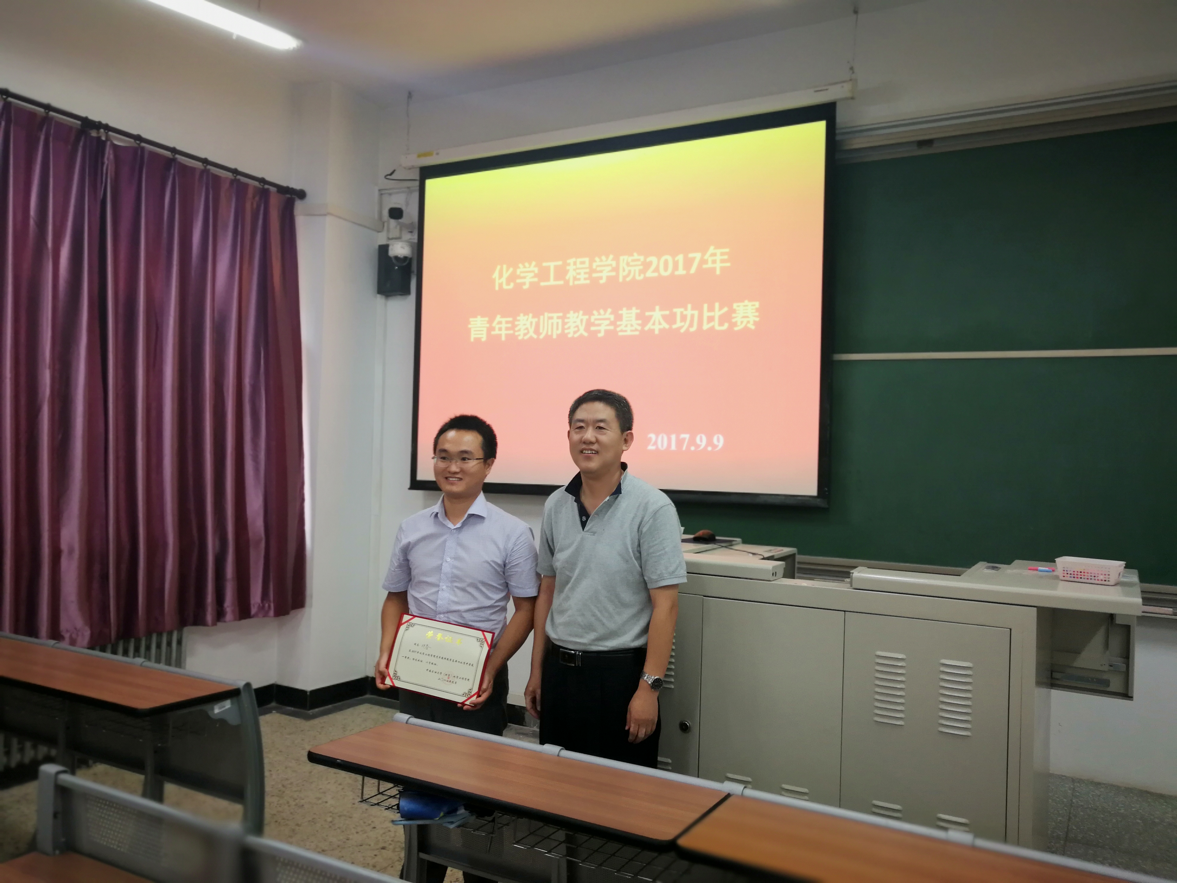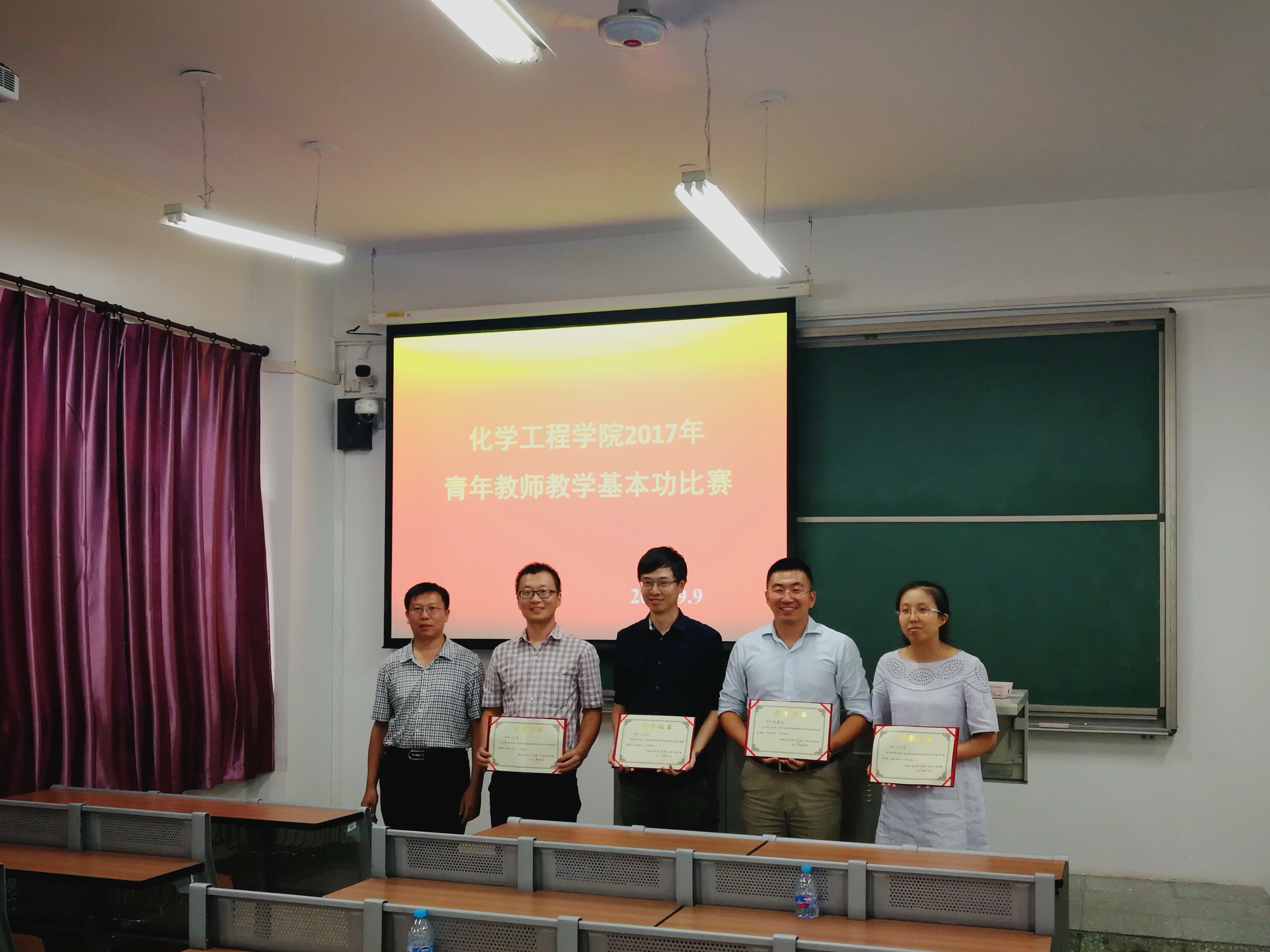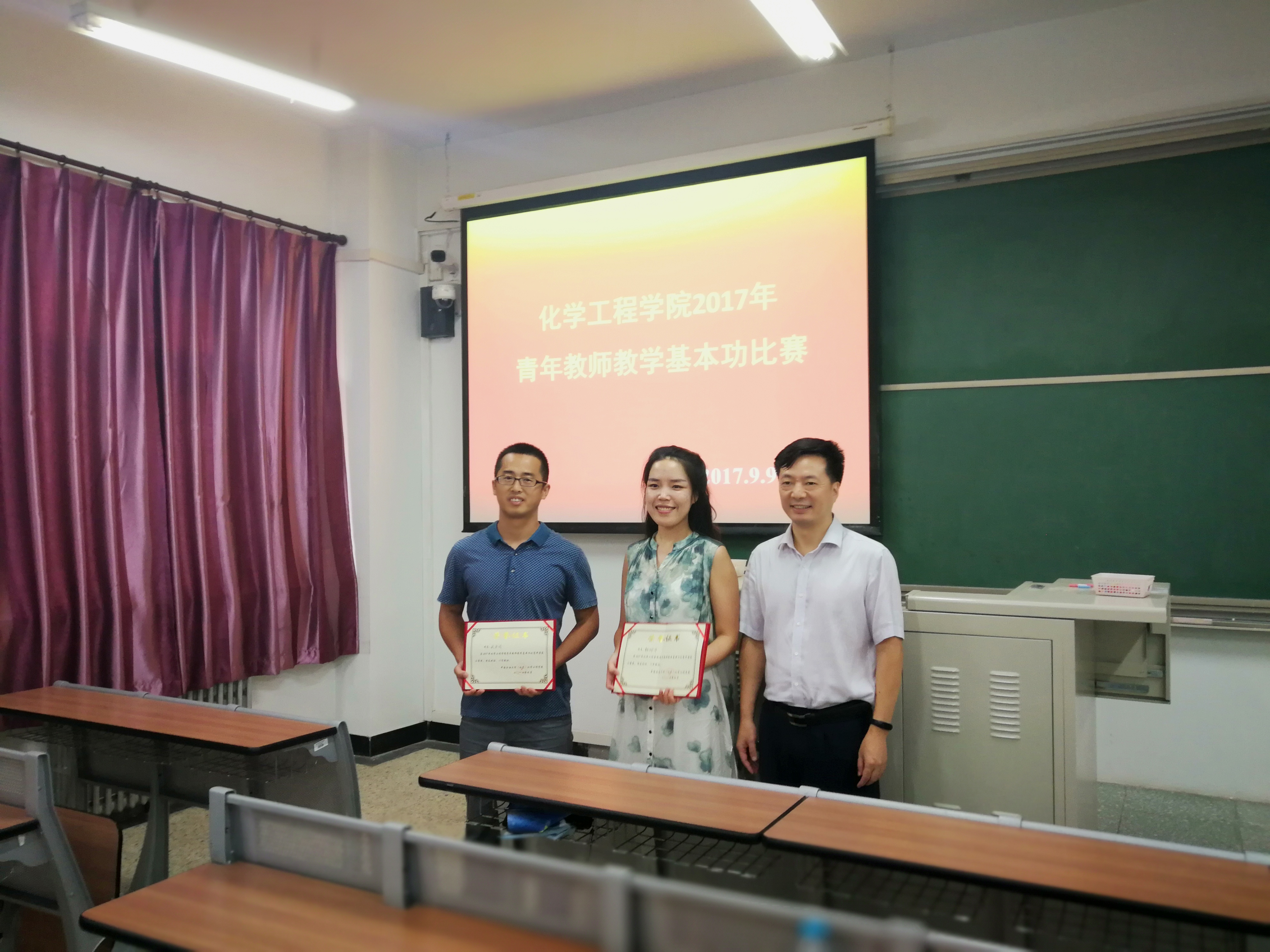 化学工程学院在教师节来临之际于2017年9月9日,在二教212成功举办了青年教师教学基本功比赛。本次比赛共有14名青年教师参加,比赛要求准备50分钟完整的教案设计以及20分钟的授课。参赛选手经过精心的准备,讲台上洋溢着青春的活力,各自展示自己的风采,经过激烈的角逐,最后参赛选手分获一等奖1名,二等奖2名,三等奖4名。获奖者分别由化工学院院长高金森教授,教学院长陈建义教授,评审委员会主任孟祥海教授为获奖者颁奖。