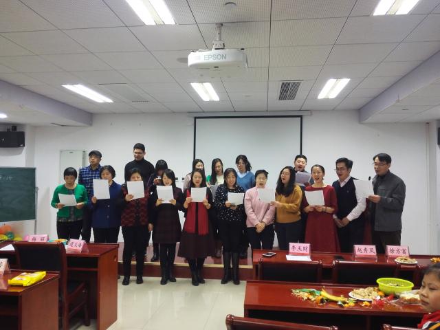 2019年1月8日16:30-18:30,外国语学院工会在学院822职工之家举办了2019年迎新年联谊会,共有五十多位老师到场共叙友谊,共话家常。这场活动喜气洋洋,热闹欢腾。工会做了精心准备,为每位老师准备了礼物,并组织各系部准备了精彩的节目。在李滨老师的演唱表演后,亚欧语教学部、英语系、办公室、公共英语教学部等部门为全院教职工表演了合唱、诗朗诵、陶笛演奏、走秀等节目,老师们还在一起参加了抽奖和游戏环节,并一一发表了工作总结和新年愿望。