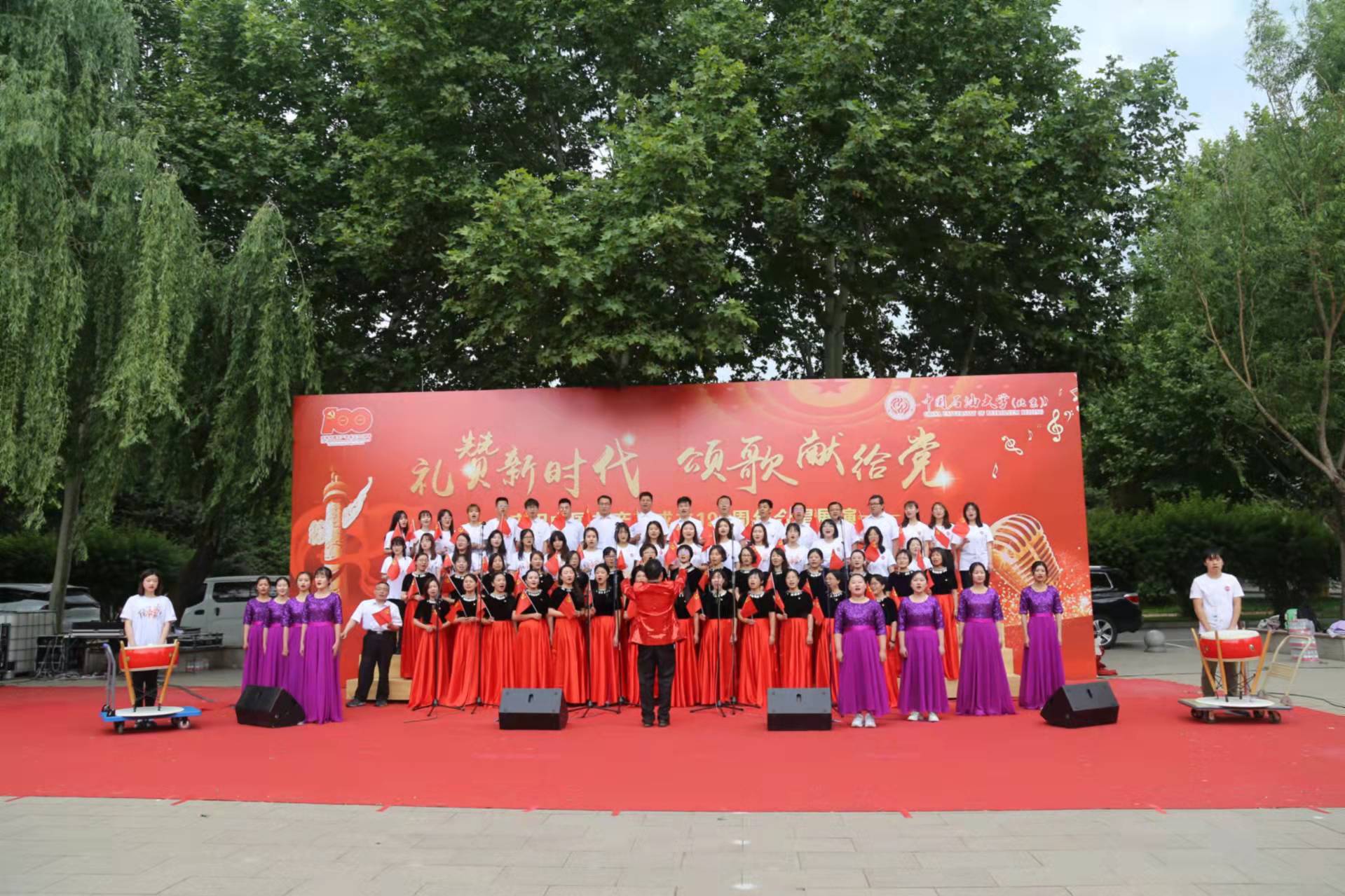 外国语学院六十多位老师和学生一道在李滨老师的指挥下缓缓登场,以饱满的状态,激情满怀,齐声高唱了《唱支山歌给党听》和《我和我的祖国》。在悠扬的伴奏声中,两位学生拿起鼓槌有节奏地击起欢快的大鼓,八位女生在齐声合唱中翩翩起舞,共建颂歌礼赞,美轮美奂的展演场景。本次展演采用师生同台室外展示方式,每天中午12点在学校南广场进行,在为期一周的展演中,各学院、部门在合唱基础上配以领唱、舞蹈、朗诵等表演形式,师生相继登台演唱了《没有共产党就没有新中国》《唱支山歌给党听》《党啊,亲爱的妈妈》《我为祖国献石油》等二十余首大家耳熟能详的红色歌曲,唱出对党的无限深情,用歌声礼赞祖国。